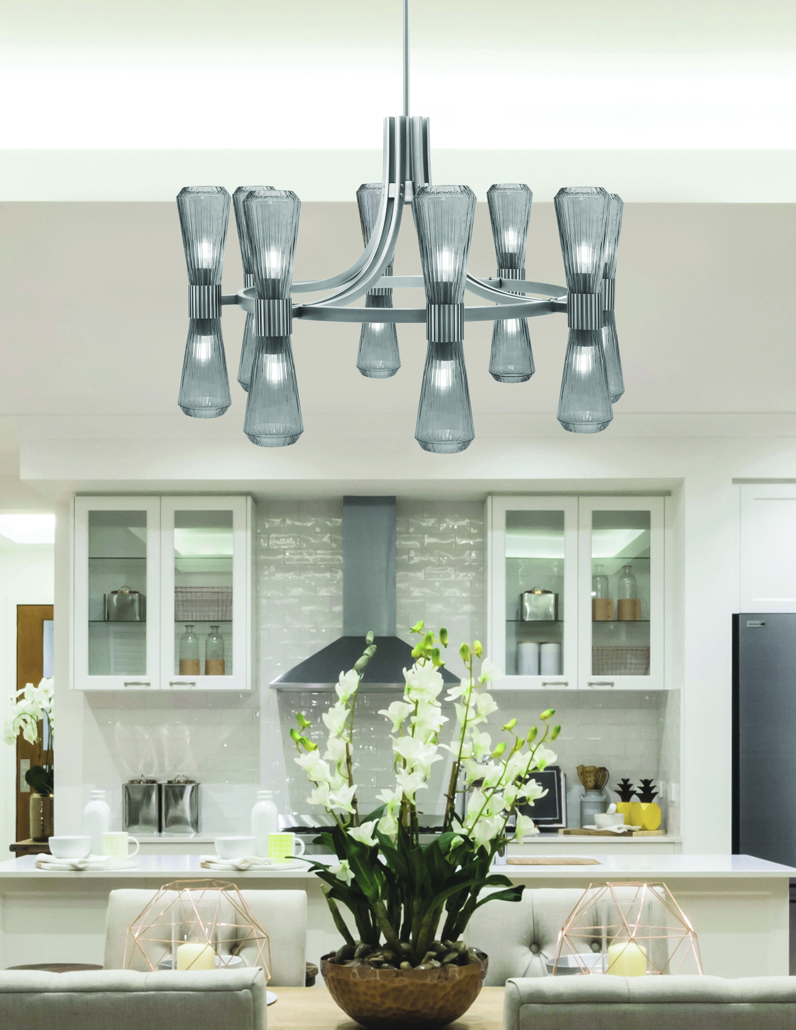 Modern design meets bold sophistication in the Everleigh 16 Light Chandelier. Finished in a deep Graphite tone, this striking fixture features sixteen lights, each paired with a 4″ smoke glass shade that casts a warm, ambient glow. The layered, geometric structure adds visual interest and scale.