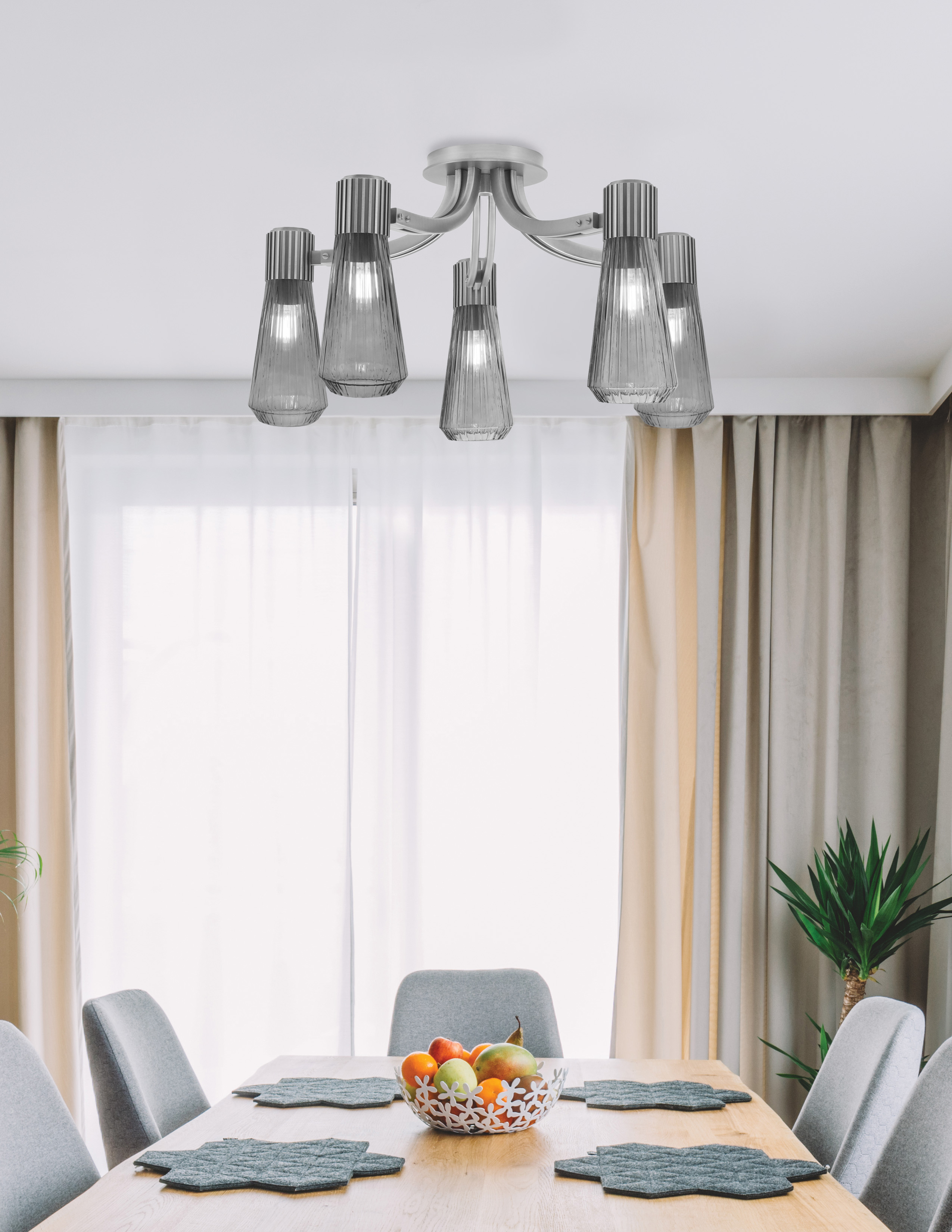 Bold yet refined, the Everleigh 5-Light Semi-Flush fixture pairs modern styling with a touch of vintage character. Its deep graphite finish sets a sleek, contemporary tone, while five 4″ smoke ribbed glass shades diffuse light with moody elegance and subtle texture. The ribbed glass adds depth and visual interest, casting a warm, ambient glow that enhances both modern and transitional interiors.