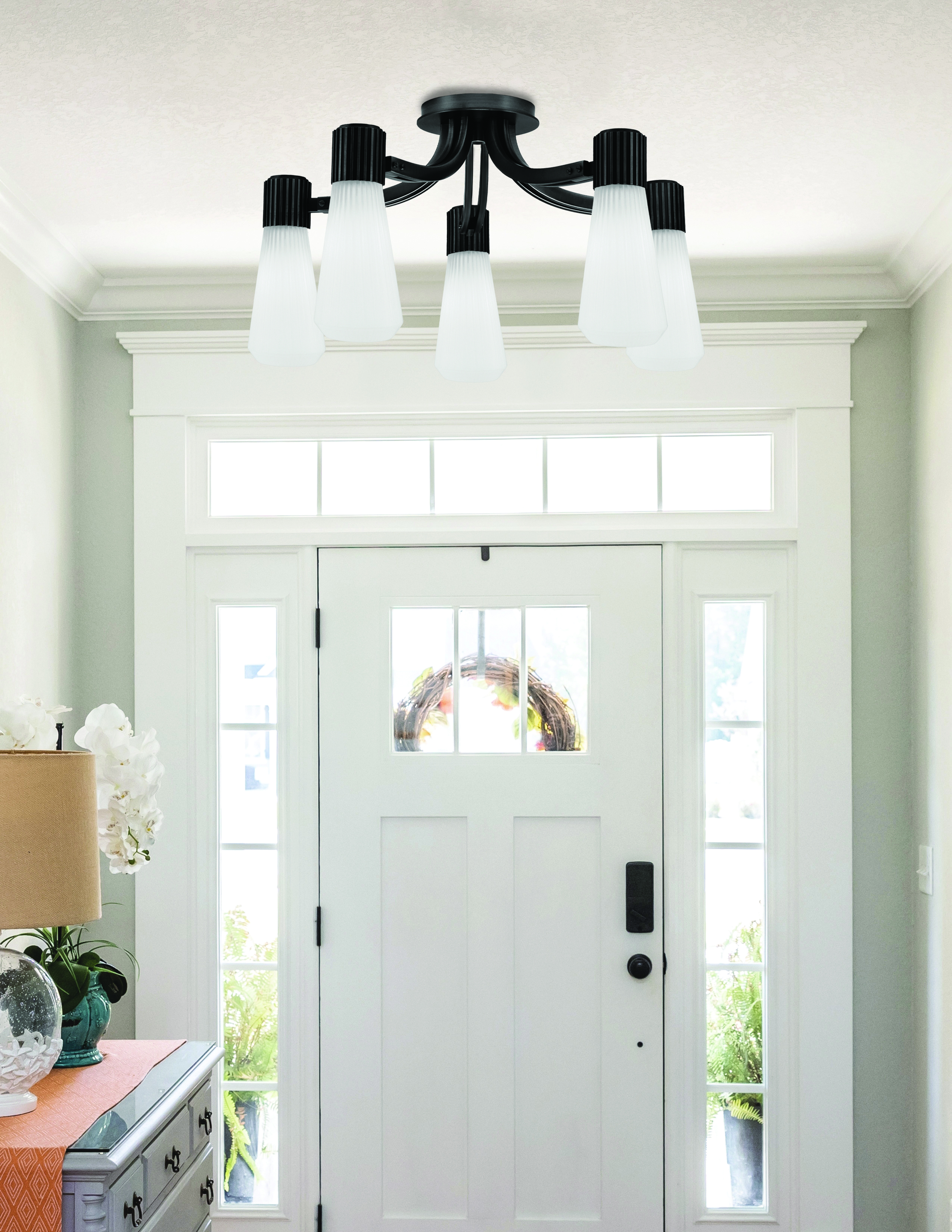 Striking a balance between bold form and soft illumination, the Everleigh 5-Light Semi-Flush adds modern elegance to any room. The matte black finish offers a clean, contemporary foundation, while five 4″ white opal ribbed glass shades gently diffuse light and introduce subtle texture. The ribbed glass evokes a touch of vintage charm, making this fixture a versatile fit for both modern and transitional spaces.