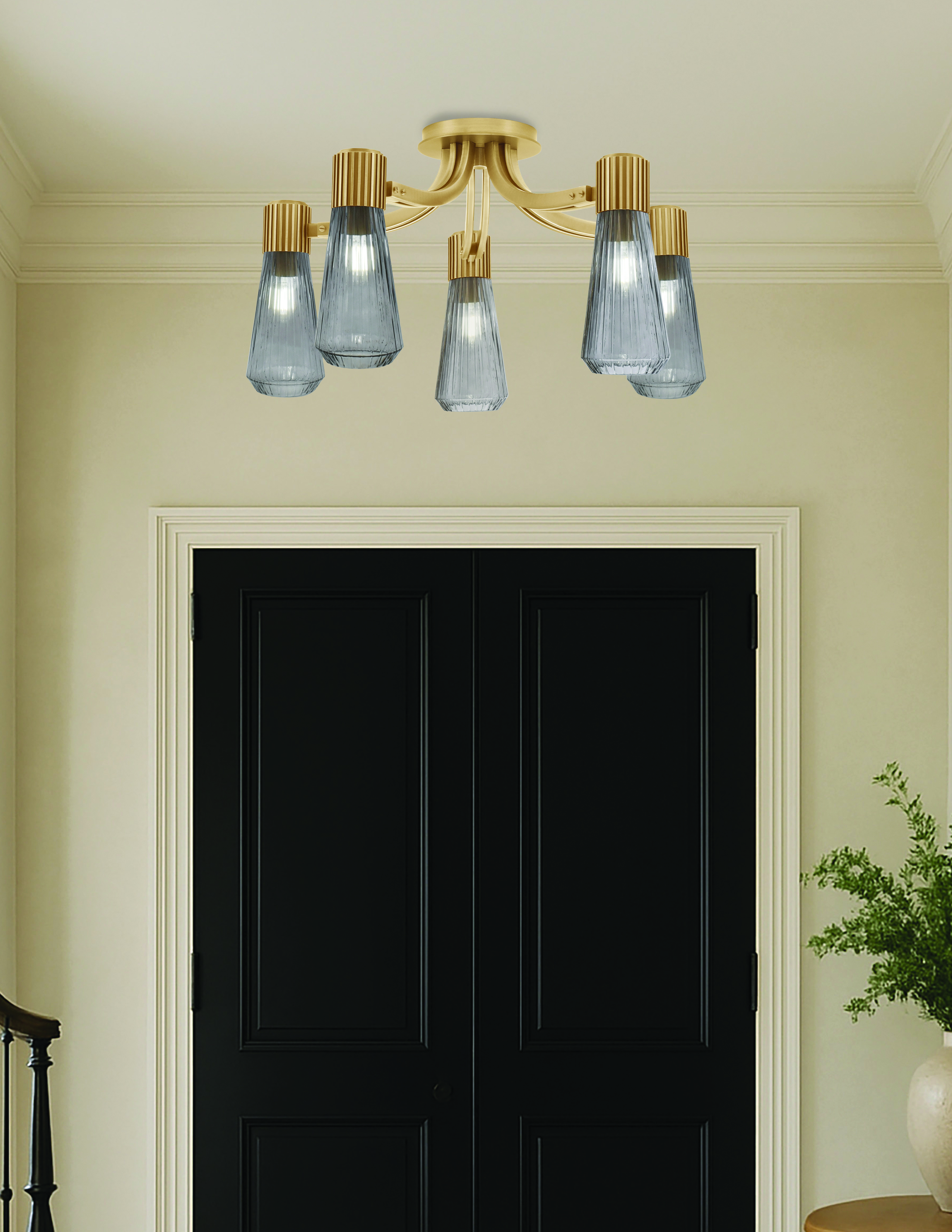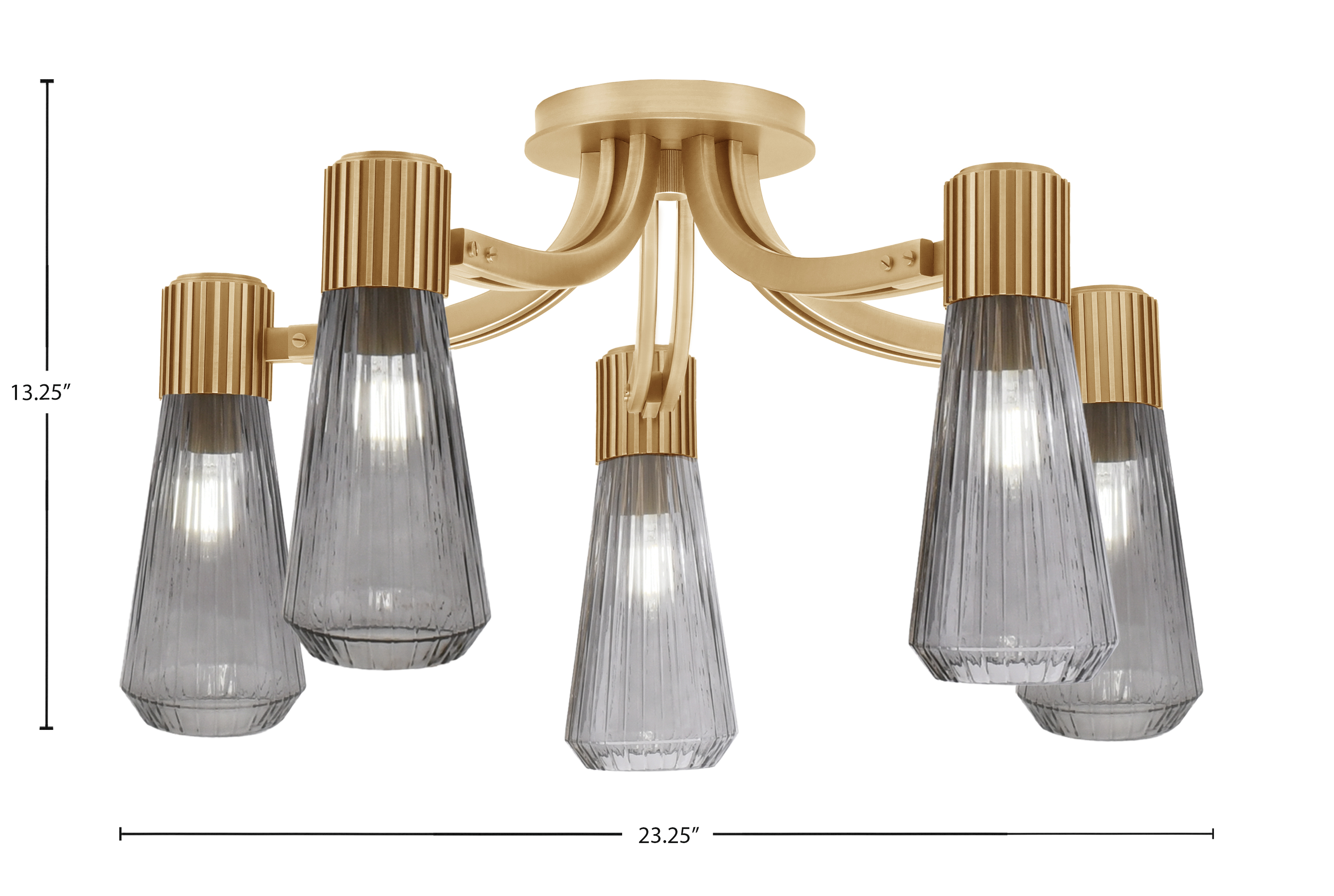 Bold yet refined, the Everleigh 5-Light Semi-Flush fixture pairs modern styling with a touch of vintage character. Its New Age Brass finish sets a sleek, contemporary tone, while five 4″ smoke ribbed glass shades diffuse light with moody elegance and subtle texture. The ribbed glass adds depth and visual interest, casting a warm, ambient glow that enhances both modern and transitional interiors.