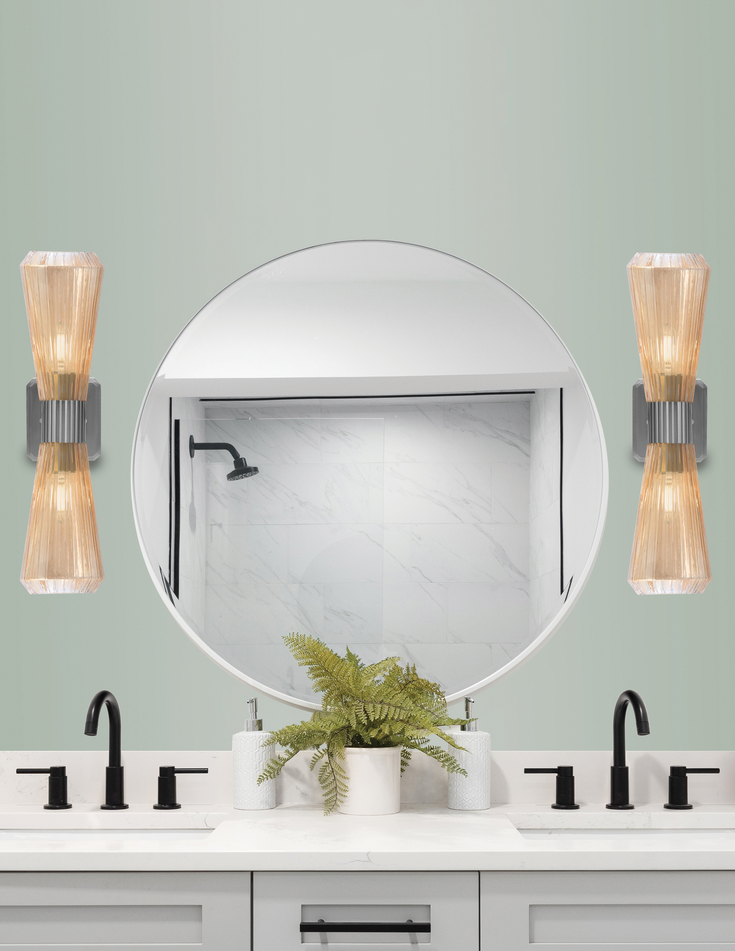 Infuse your space with warmth and contemporary elegance with the Everleigh 2 Light Wall Sconce. The sleek Graphite Finish provides a modern, refined frame, while the 4″ Amber Ribbed Glass shades cast a rich, golden glow. The ribbed detailing enhances the glass with texture and depth, creating beautifully diffused light that adds both ambiance and visual interest.