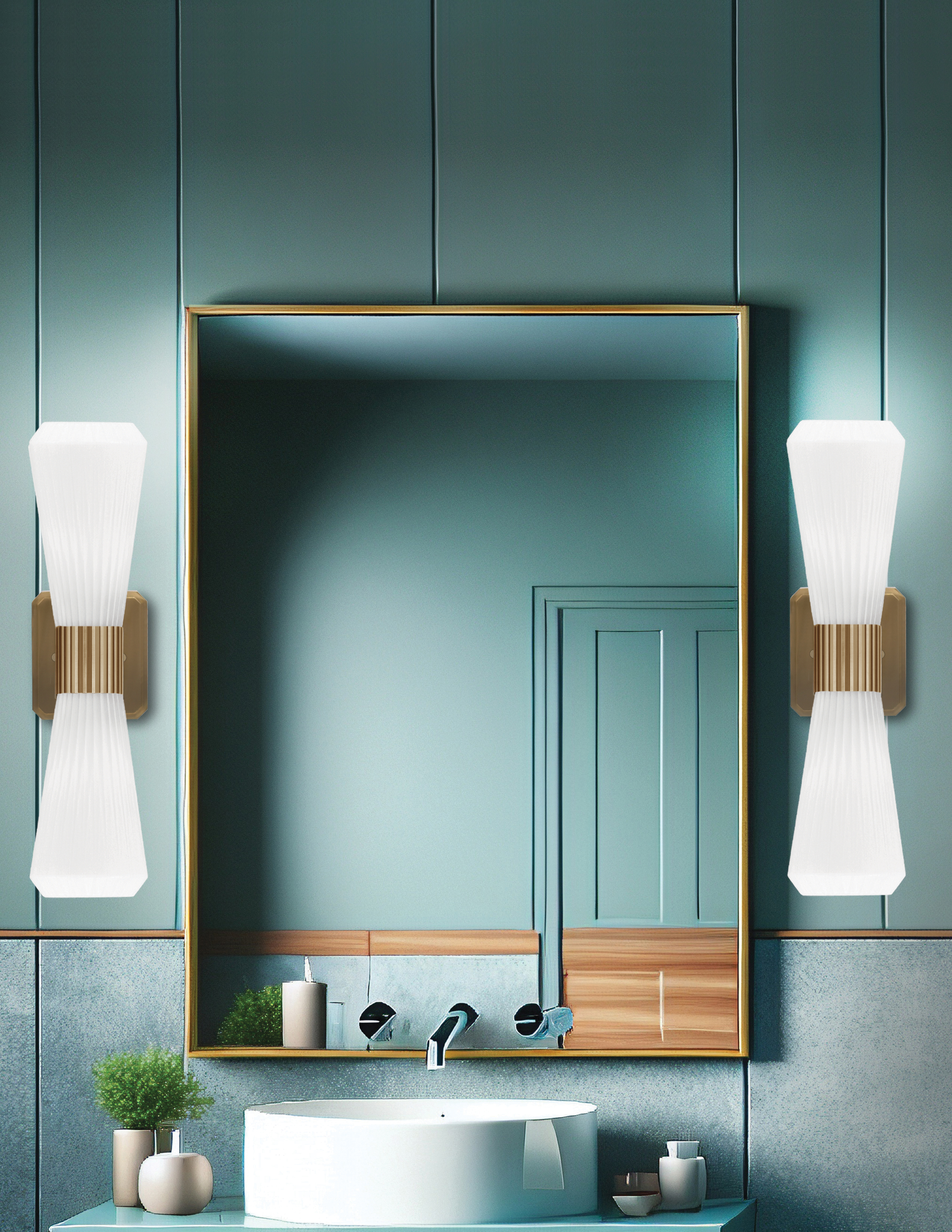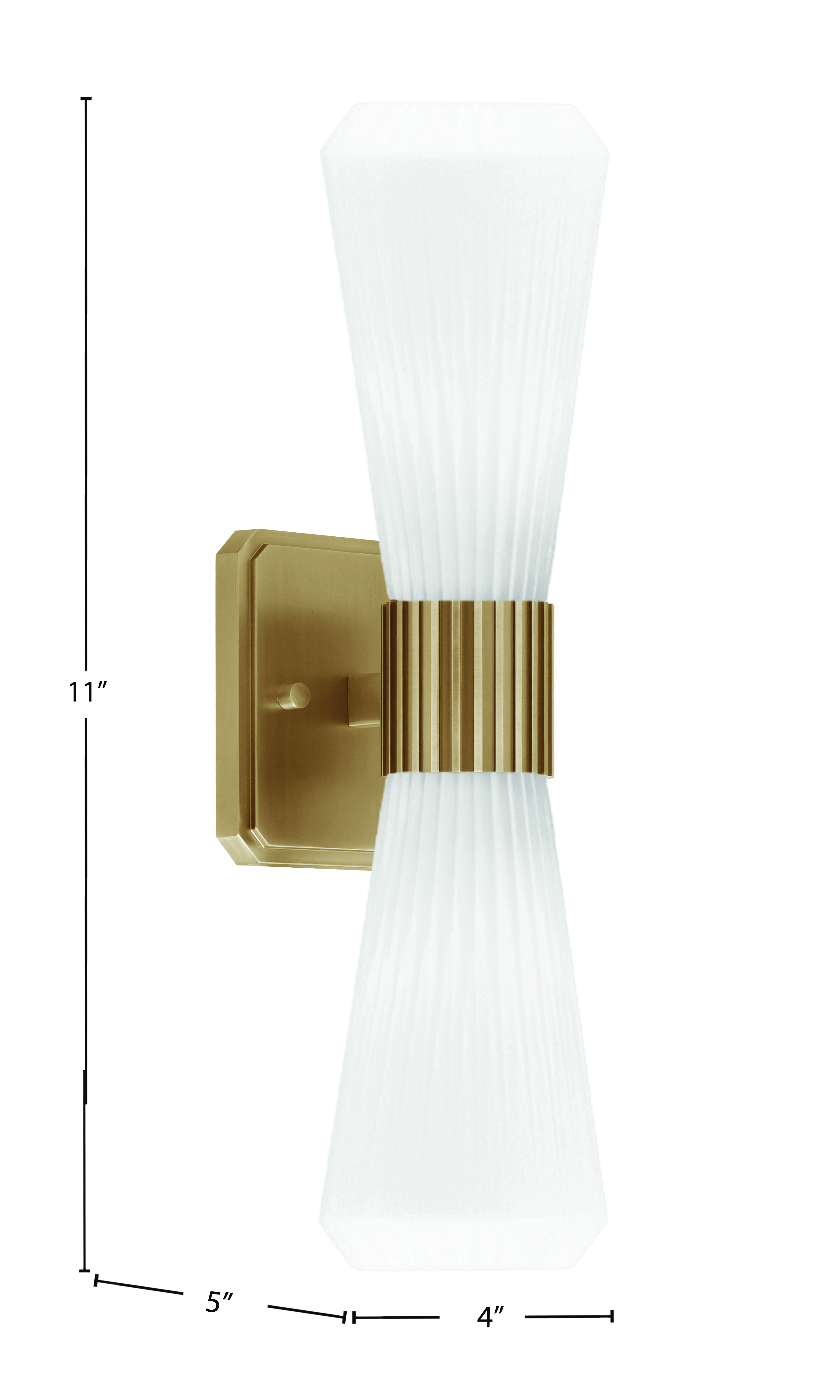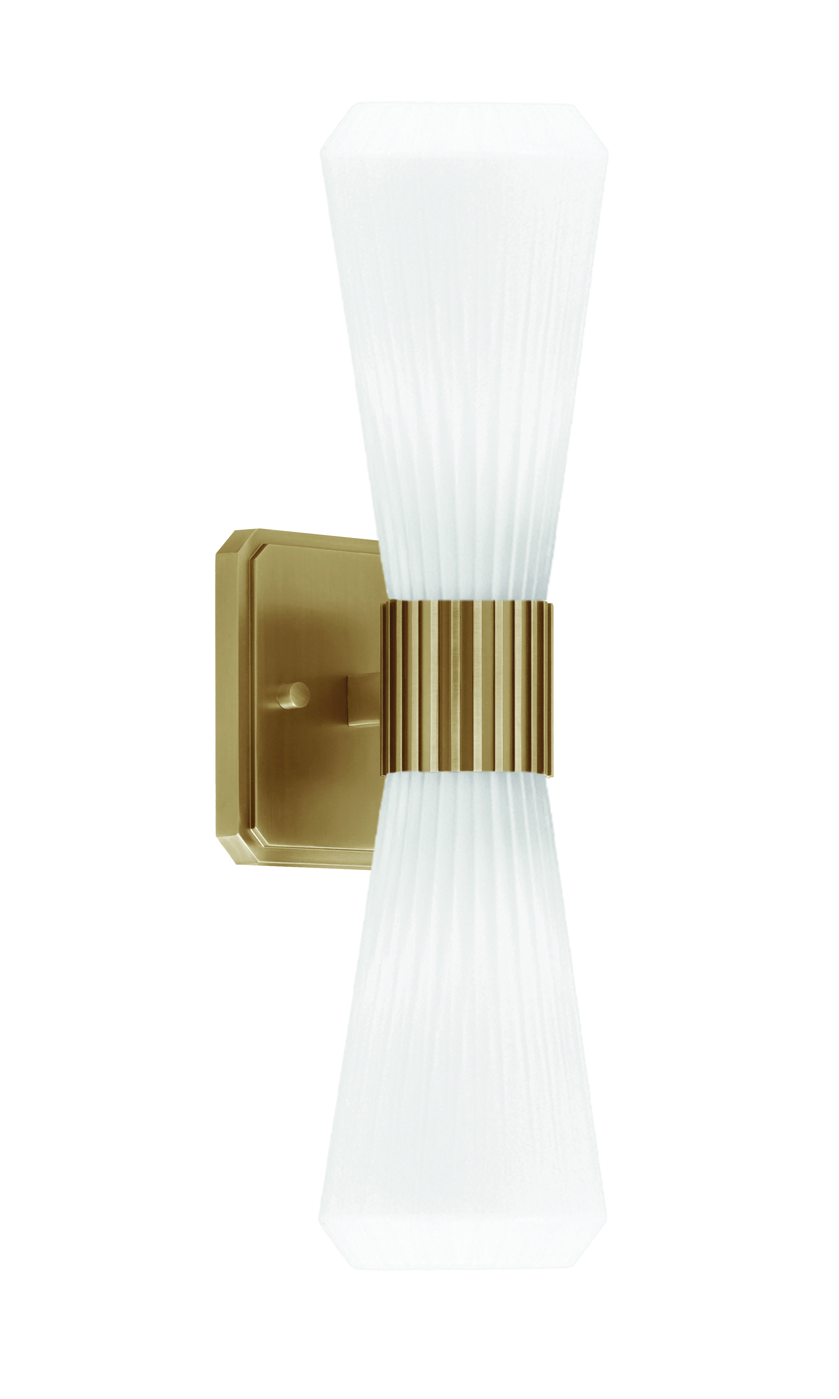 The Everleigh 2 Light Wall Sconce blends contemporary design with timeless appeal, offering both functional lighting and elevated style. The rich brass finish adds a contemporary yet timeless touch, while the white opal ribbed glass softly diffuses light for a smooth, even glow. The ribbed detailing enhances texture and visual depth, elevating both style and illumination.