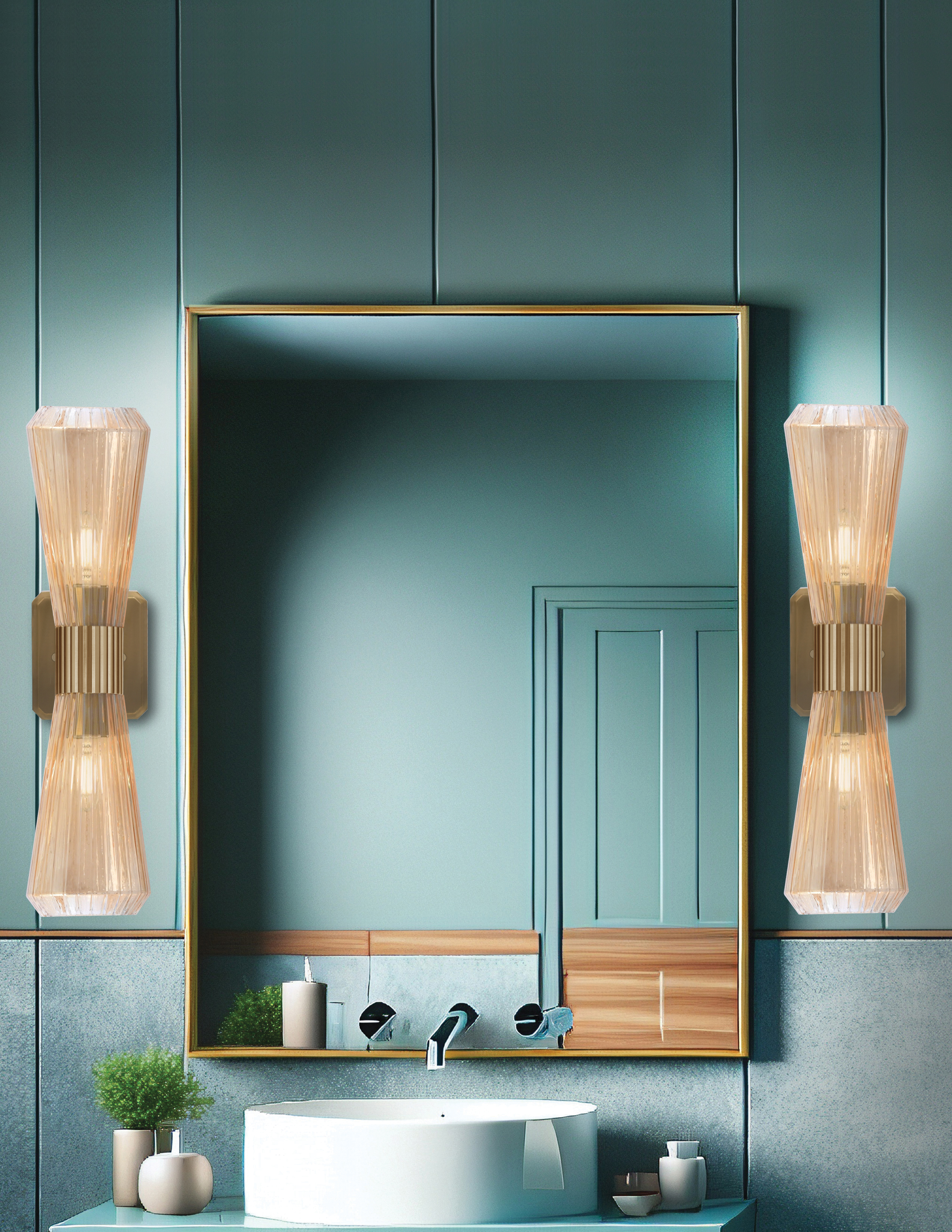 Bring warmth and sophisticated style to your space with the Everleigh 2 Light Wall Sconce, shown in a luxurious New Age Brass Finish paired with 4″ Amber Ribbed Glass shades. The brass frame adds a refined, contemporary touch, while the amber glass casts a rich, inviting glow. Ribbed detailing enhances texture and depth, creating beautifully diffused light and a warm, welcoming ambiance.
