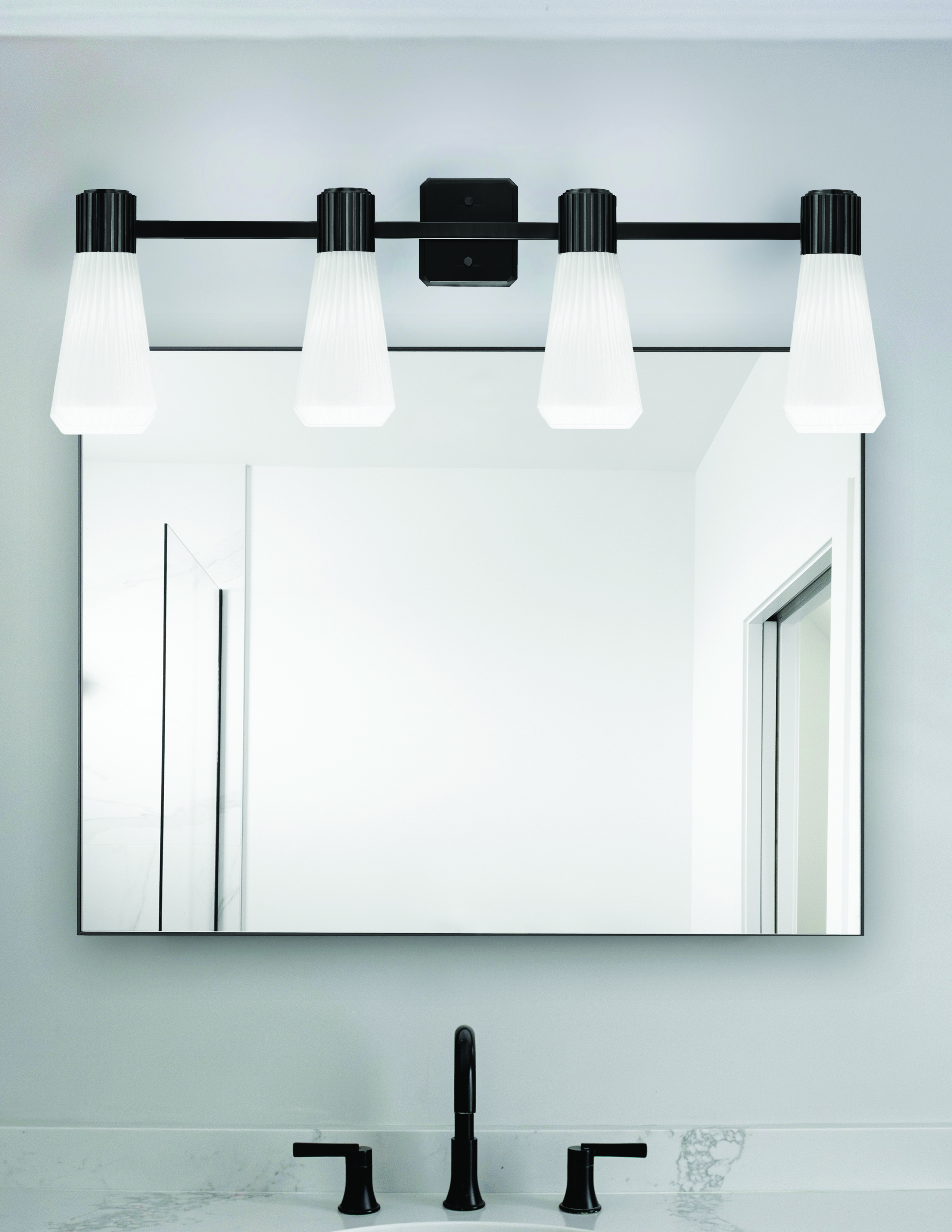Clean lines and soft texture define the Everleigh 4-Light Bath Bar. The matte black finish brings a bold, contemporary edge, while four 4″ white opal ribbed glass shades offer diffused, flattering illumination. The ribbed glass adds subtle dimension and a touch of vintage character, making this fixture a stylish addition to both modern and transitional bathrooms.