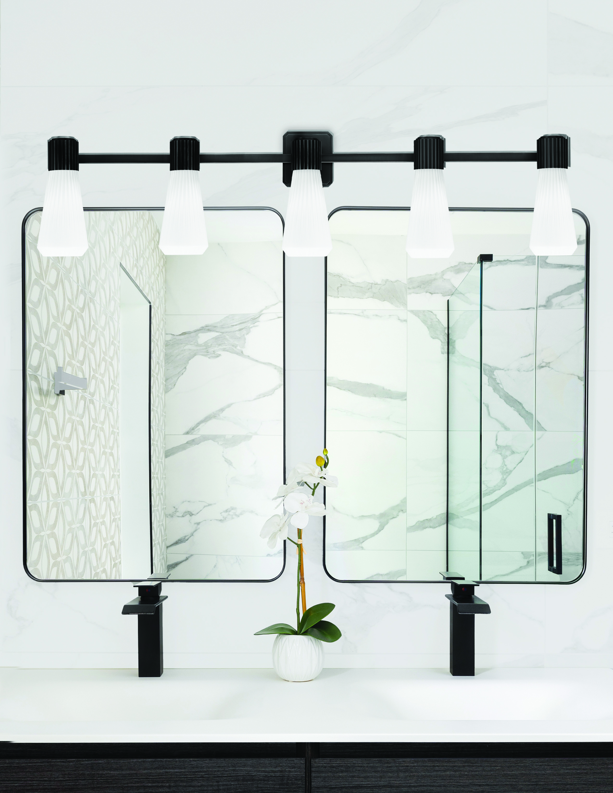 The Everleigh 5 Light Bath Bar offers sleek, modern elegance with its bold matte black finish. Paired with pristine 4″ White Glass shades, this fixture delivers a bright, even illumination perfect for any bathroom or vanity area. With five lights, it provides ample lighting for grooming or relaxing, while the clean design adds a touch of contemporary sophistication to your space.