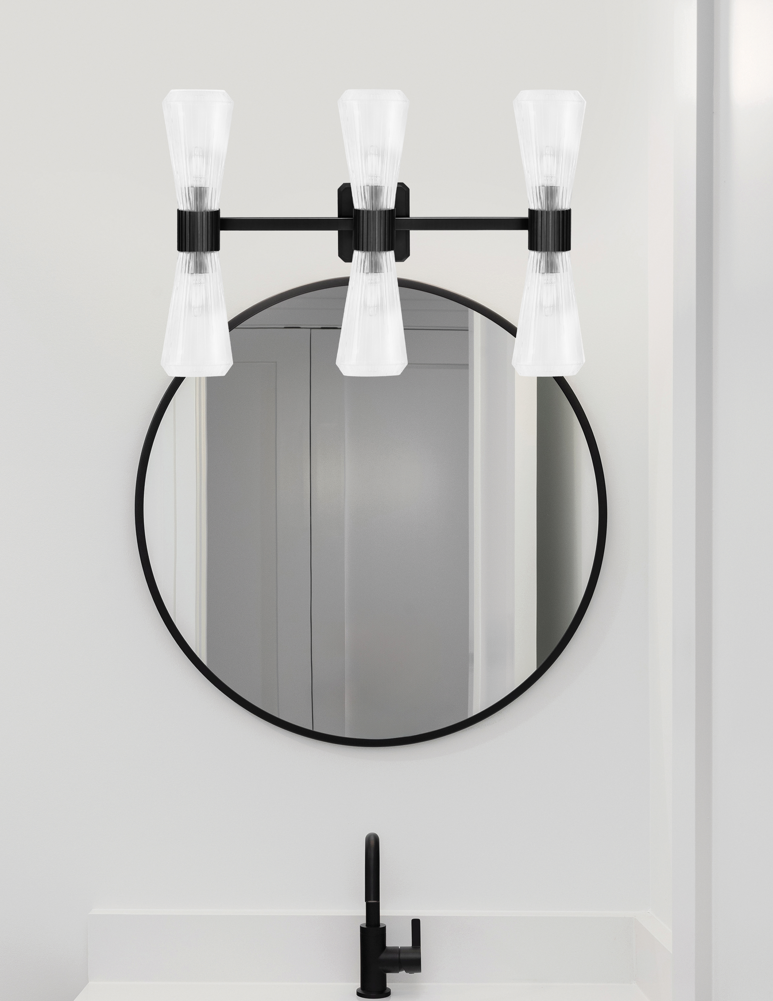 Bold and contemporary, the Everleigh 6 Light Bath Bar features a Matte Black Finish paired with six 4″ Clear Ribbed Glass shades. The ribbed Glass softly diffuses light while adding subtle texture, creating a warm, inviting glow for any bathroom or powder room. Its clean, linear design provides a sophisticated look that complements both modern and transitional interiors.