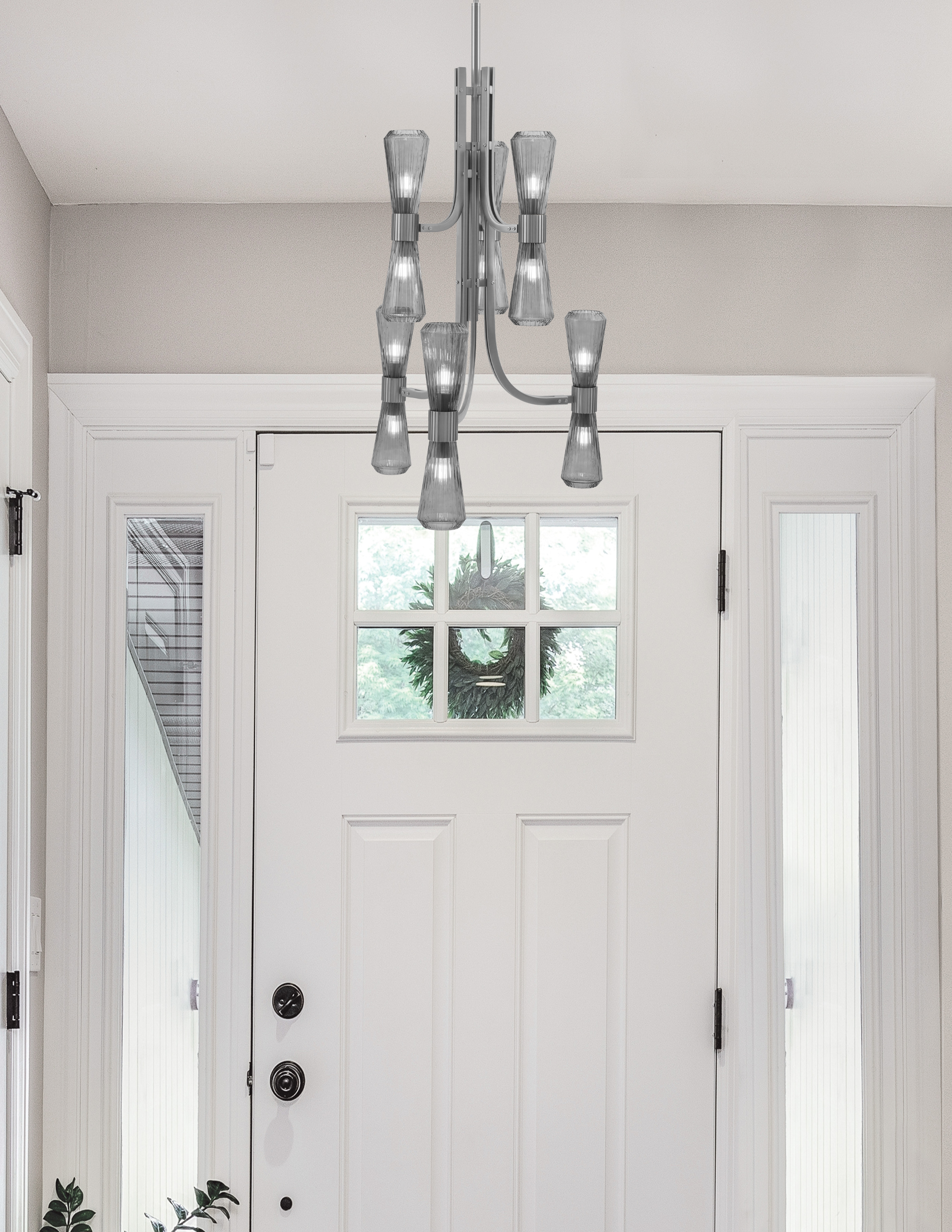 Bold and contemporary, the Everleigh 12 Light Chandelier in Graphite finish brings architectural elegance to modern interiors. Its clean, tiered silhouette supports, twelve evenly spaced 4″ smoke glass shades, offering a rich, moody glow that enhances ambiance without overpowering the space. The Graphite finish adds a sleek, industrial edge, while the smoke glass softens the look with atmospheric light diffusion.