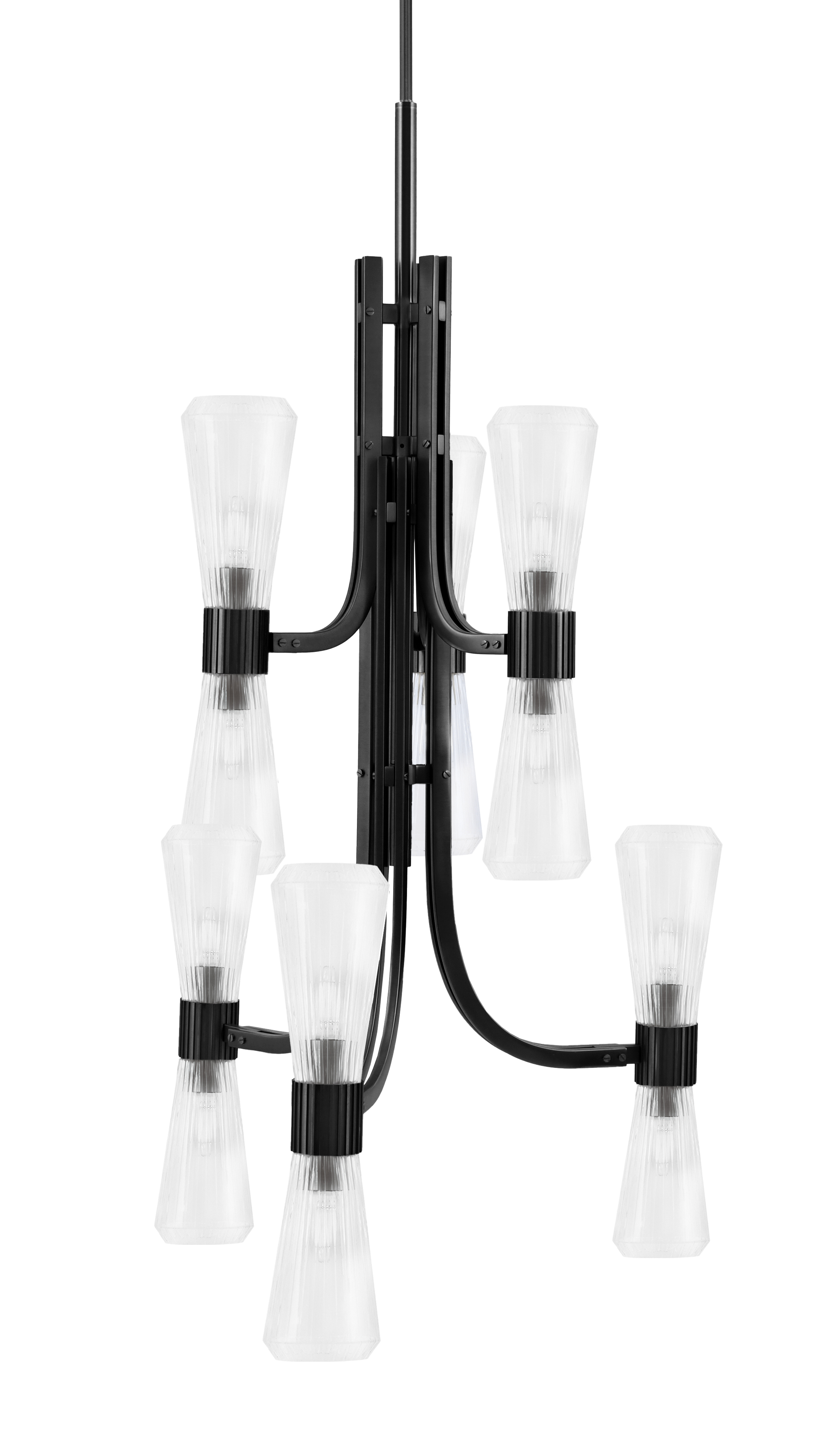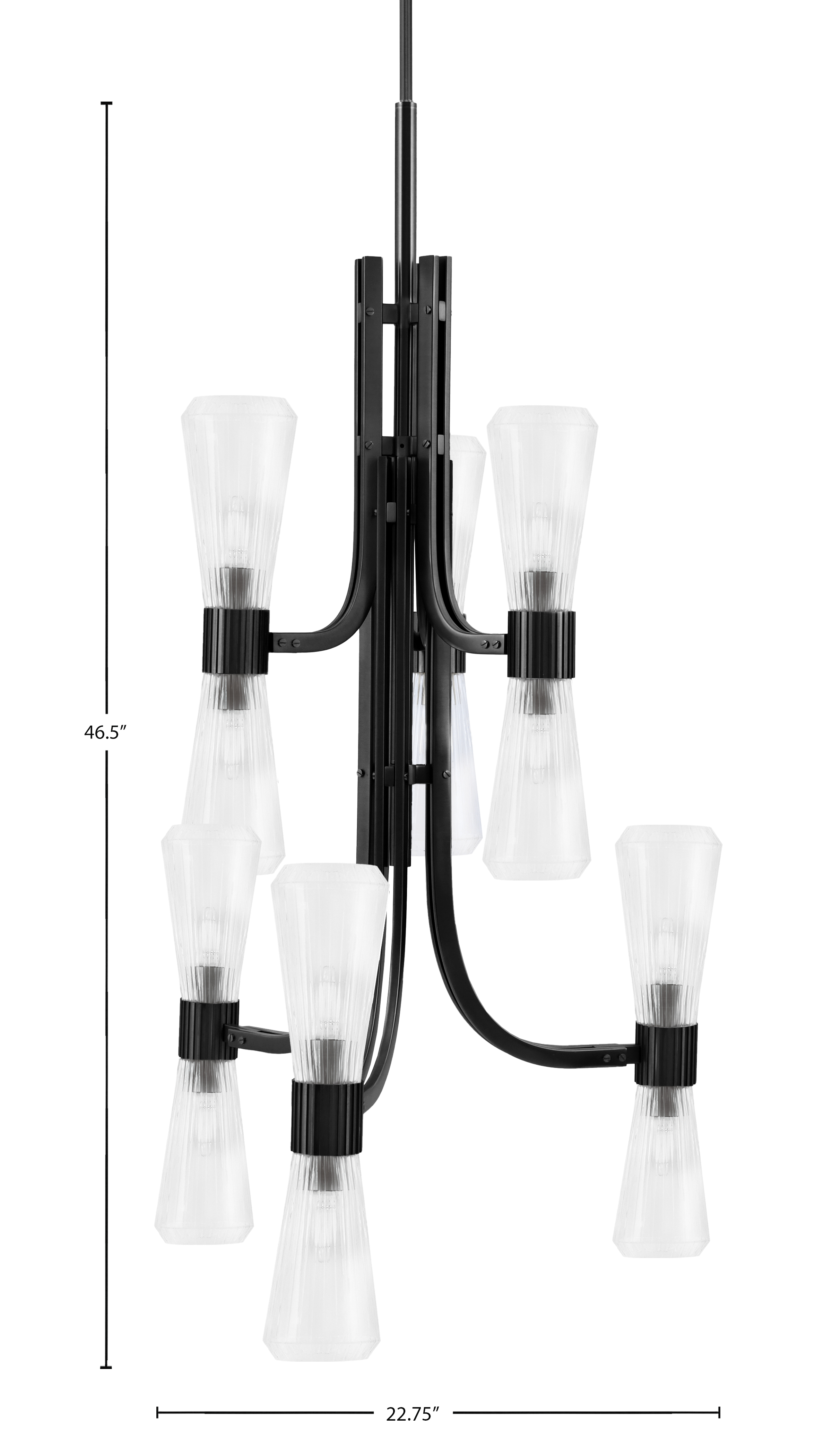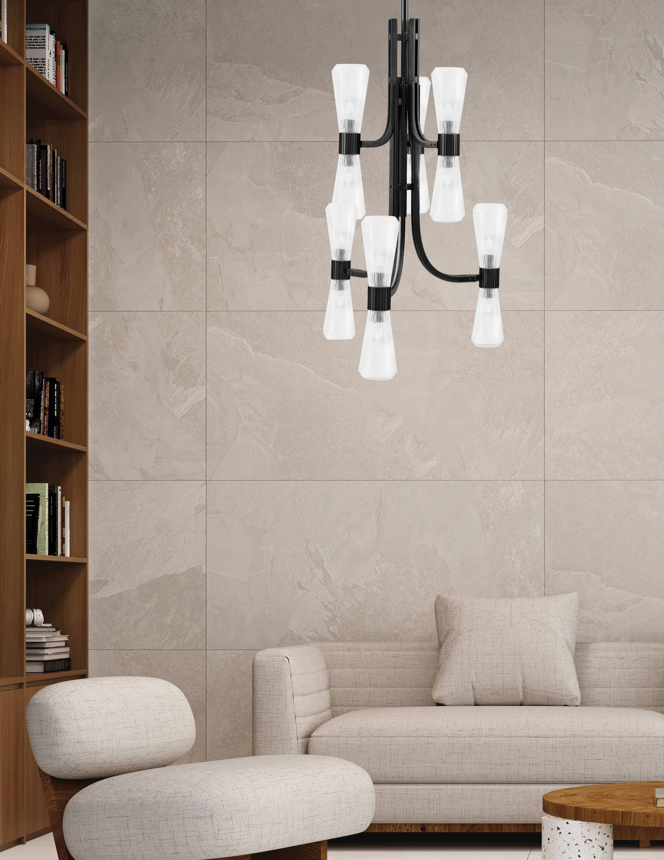 With twelve lights arranged in a clean, symmetrical form, this chandelier combines modern structure with timeless elegance. The Matte Black Finish provides a sophisticated contrast to the Clear Ribbed Glass shades, which distribute light evenly while adding visual depth. Ideal for larger spaces, it delivers both style and functional illumination.