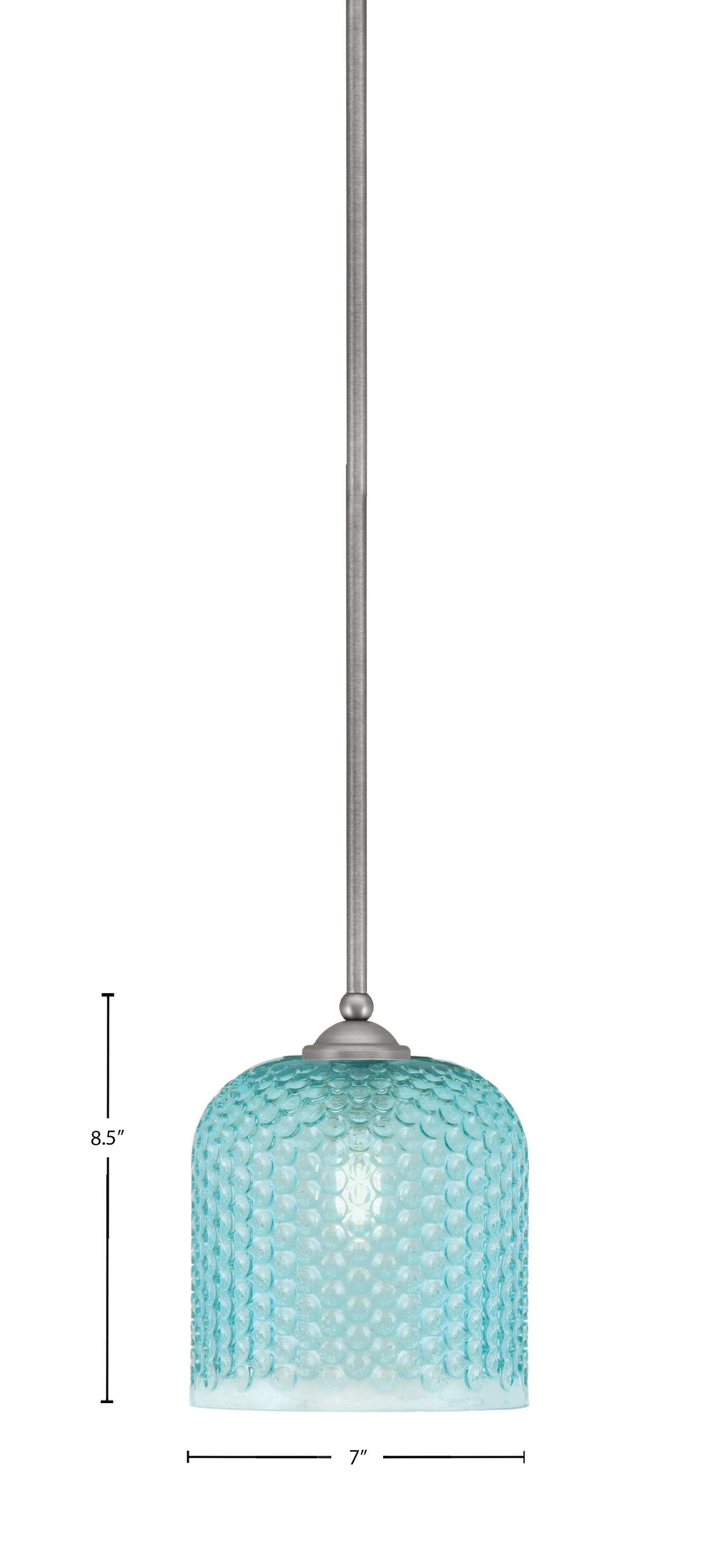 Bright turquoise textured glass shines against a sleek graphite finish, creating a mini pendant that bursts with energy and style. The 7″ shade ripples beautifully, scattering light like sunlit waves to add a playful, refreshing vibe to any room. Perfect for kitchens, bars, or cozy corners, this pendant makes a bold, colorful statement.