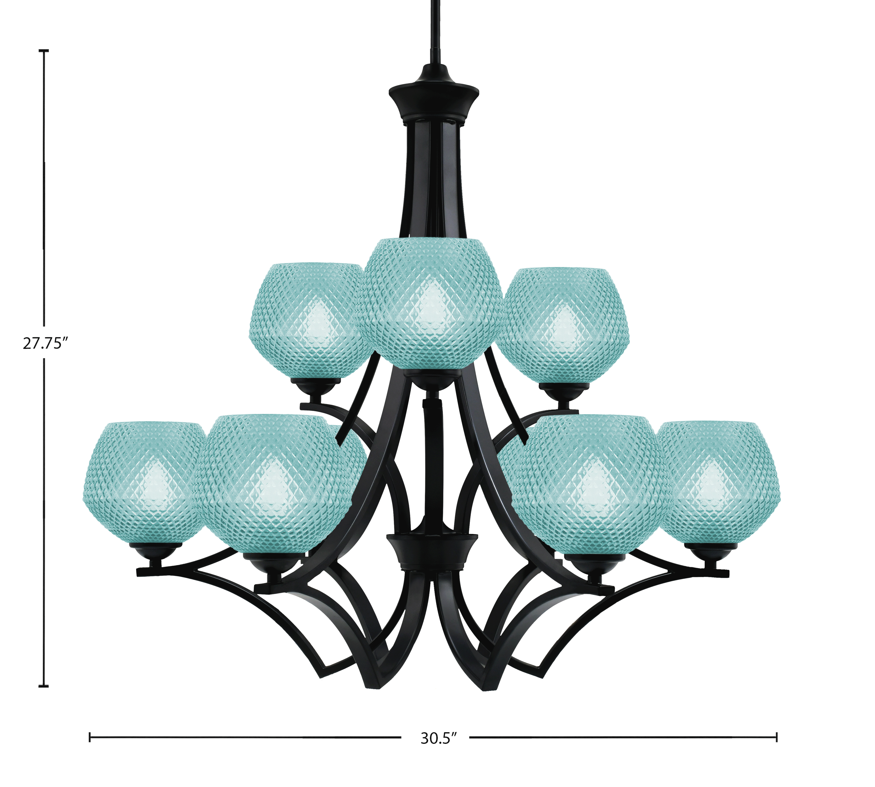 A vibrant cascade of nine turquoise glass shades brings a refreshing splash of color to this modern chandelier. The deep Matte Black Finish frames each textured globe with striking contrast, highlighting the design’s bold geometry. It’s a dynamic centerpiece that energizes any room with style and light.