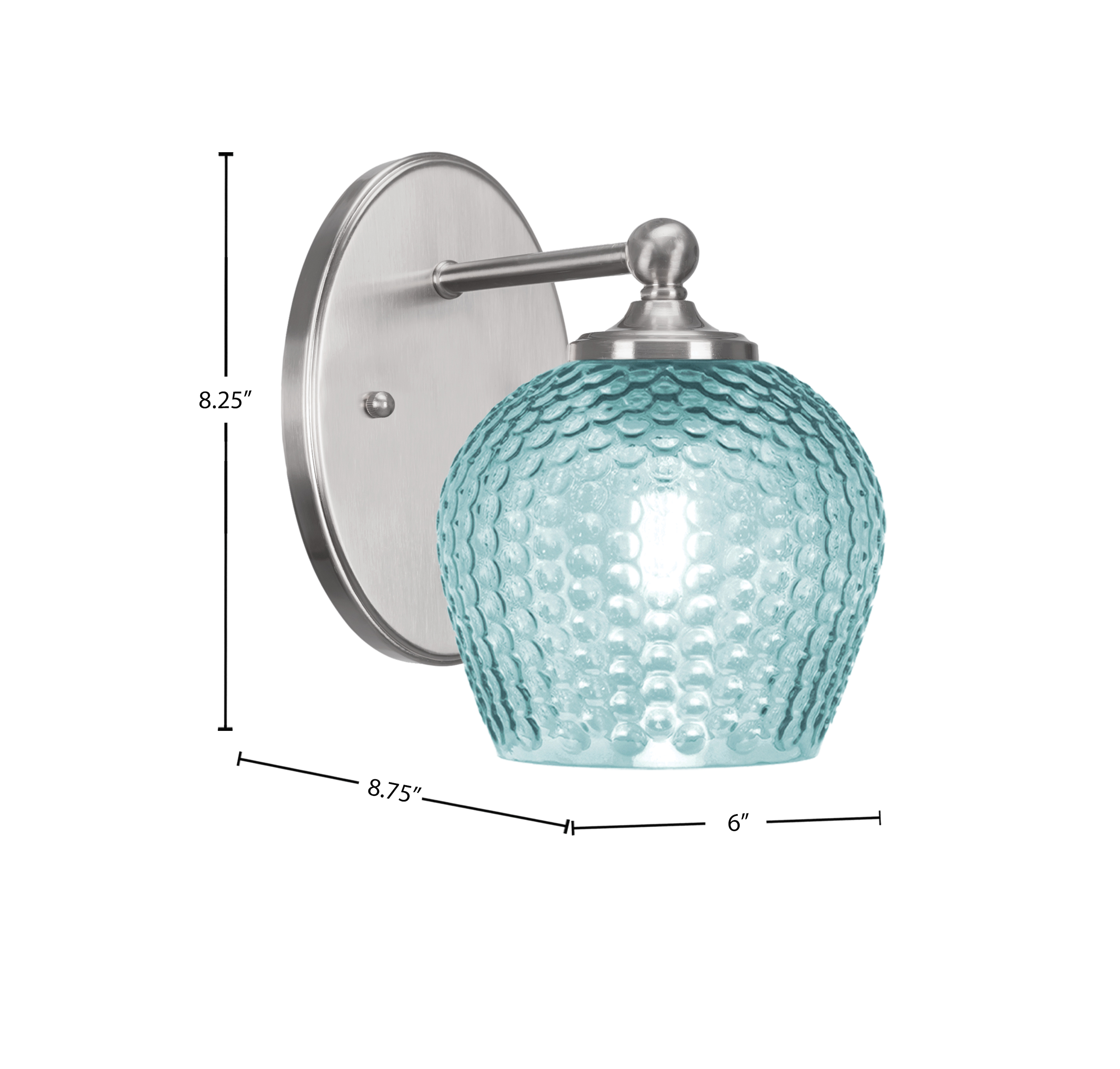 Refresh your walls with the playful elegance of the Capri Wall Sconce. Featuring a sleek Brushed Nickel finish, this fixture is beautifully accented by a vibrant 6″ Turquoise Textured Glass shade. The result is a striking combination of modern sophistication and eye-catching color that brings your space to life.