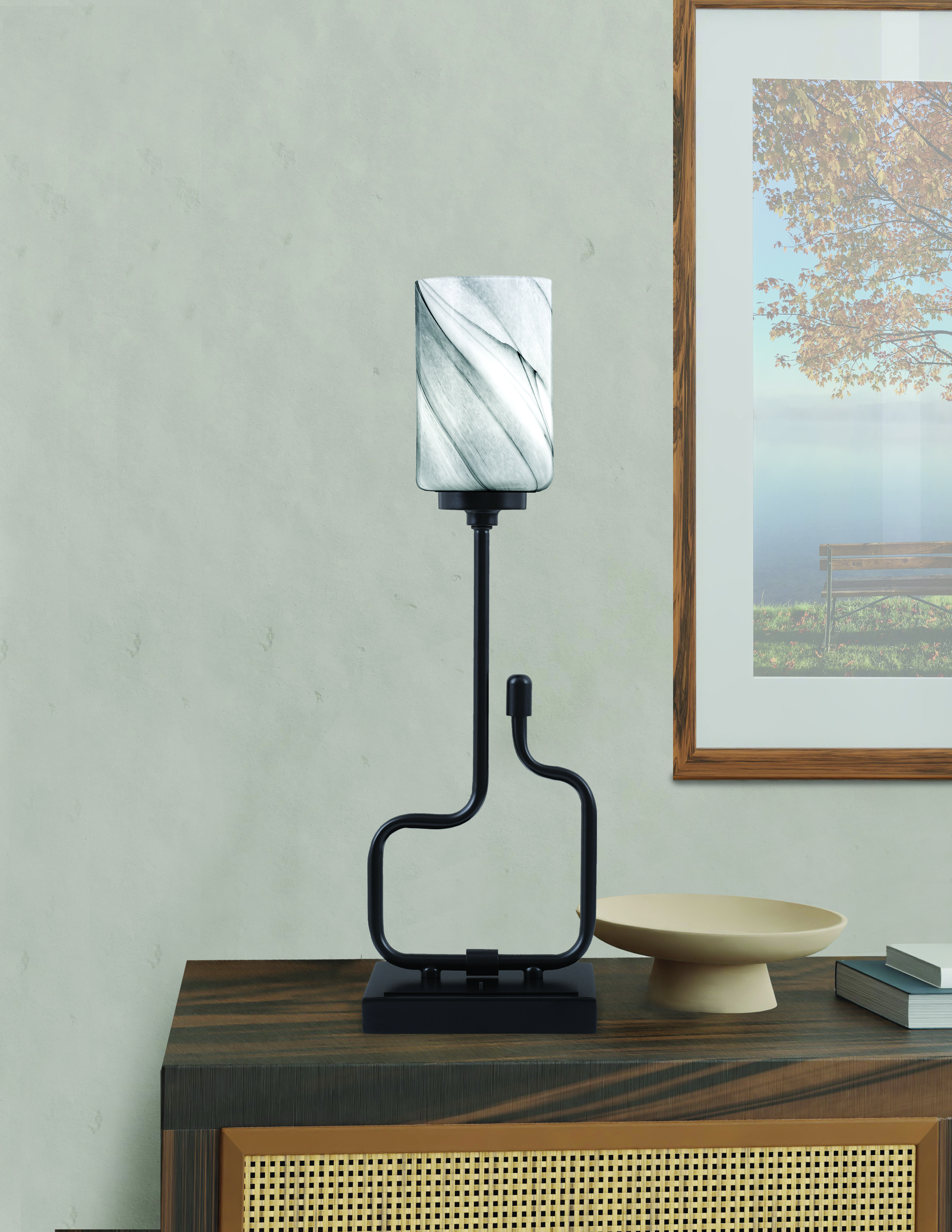 Bring a touch of modern elegance to your space with the Sandia Accent Lamp. The matte black finish provides a sleek, contemporary look, while the 4″ onyx swirl glass shade introduces an artistic flair. Perfectly sized for accent lighting, this lamp is ideal for bedside tables, desks, or small accent spaces.