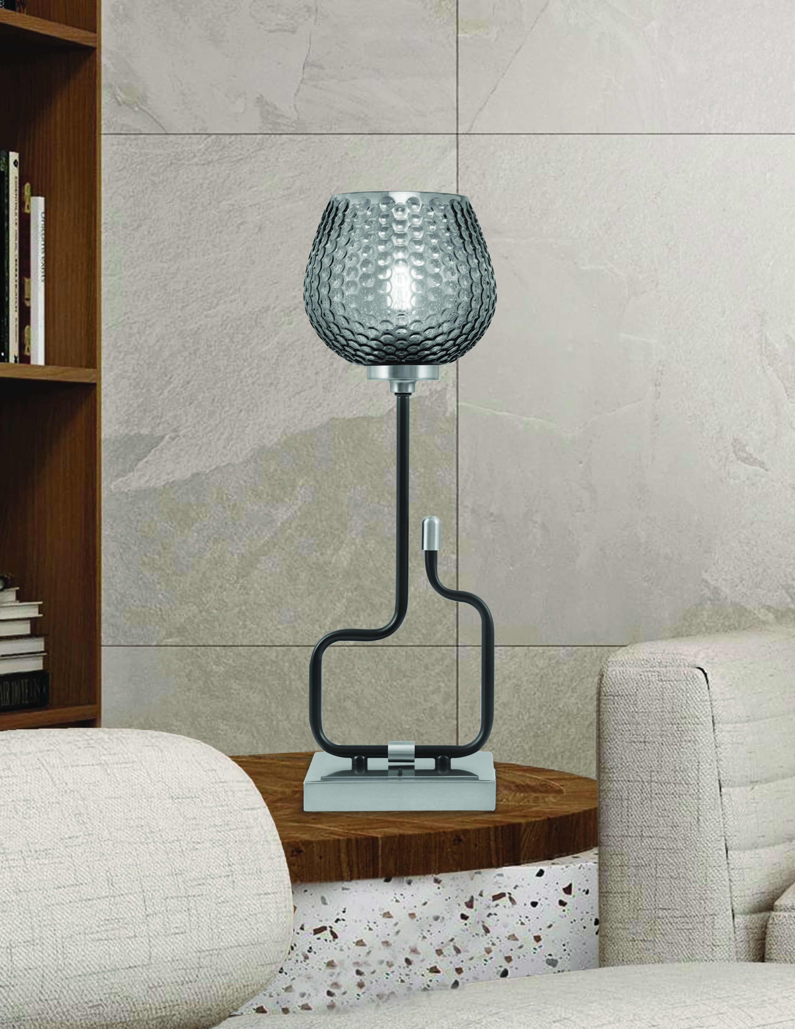 Create an elegant focal point in your space with the Sandia Accent Lamp, featuring a sleek matte black and graphite finish. The 6″ smoke textured glass shade offers a subtle smoky hue with rich textures. The soft, diffused glow from the smoke glass adds warmth and depth, making it perfect for accent lighting in any room.