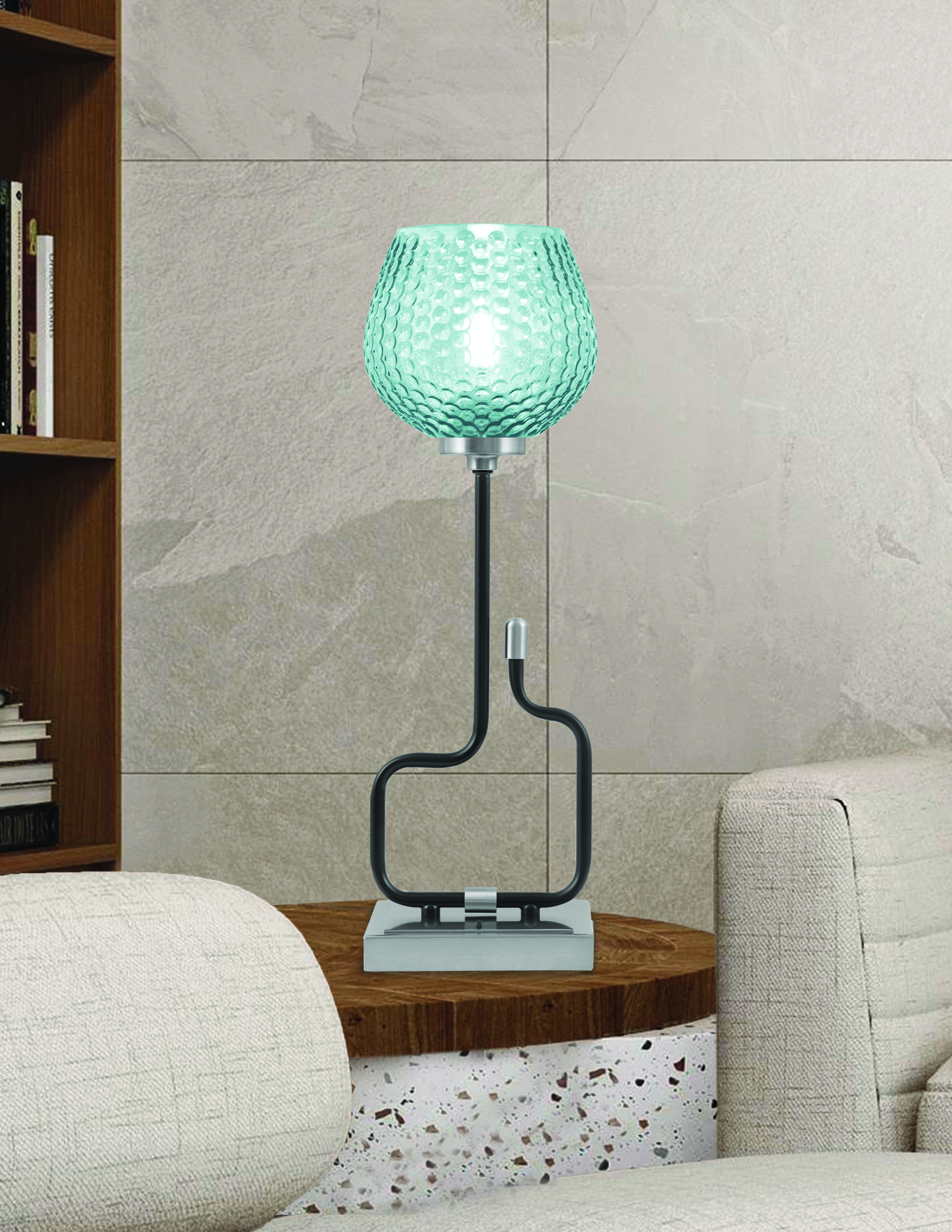 Add a pop of color and elegance to your space with the Sandia Accent Lamp, featuring a sophisticated matte black and graphite finish. The 6″ turquoise textured glass shade brings a refreshing splash of color, with its intricate texture. Its dynamic combination of modern finishes and vibrant turquoise glass makes it a versatile addition to contemporary and eclectic interiors.