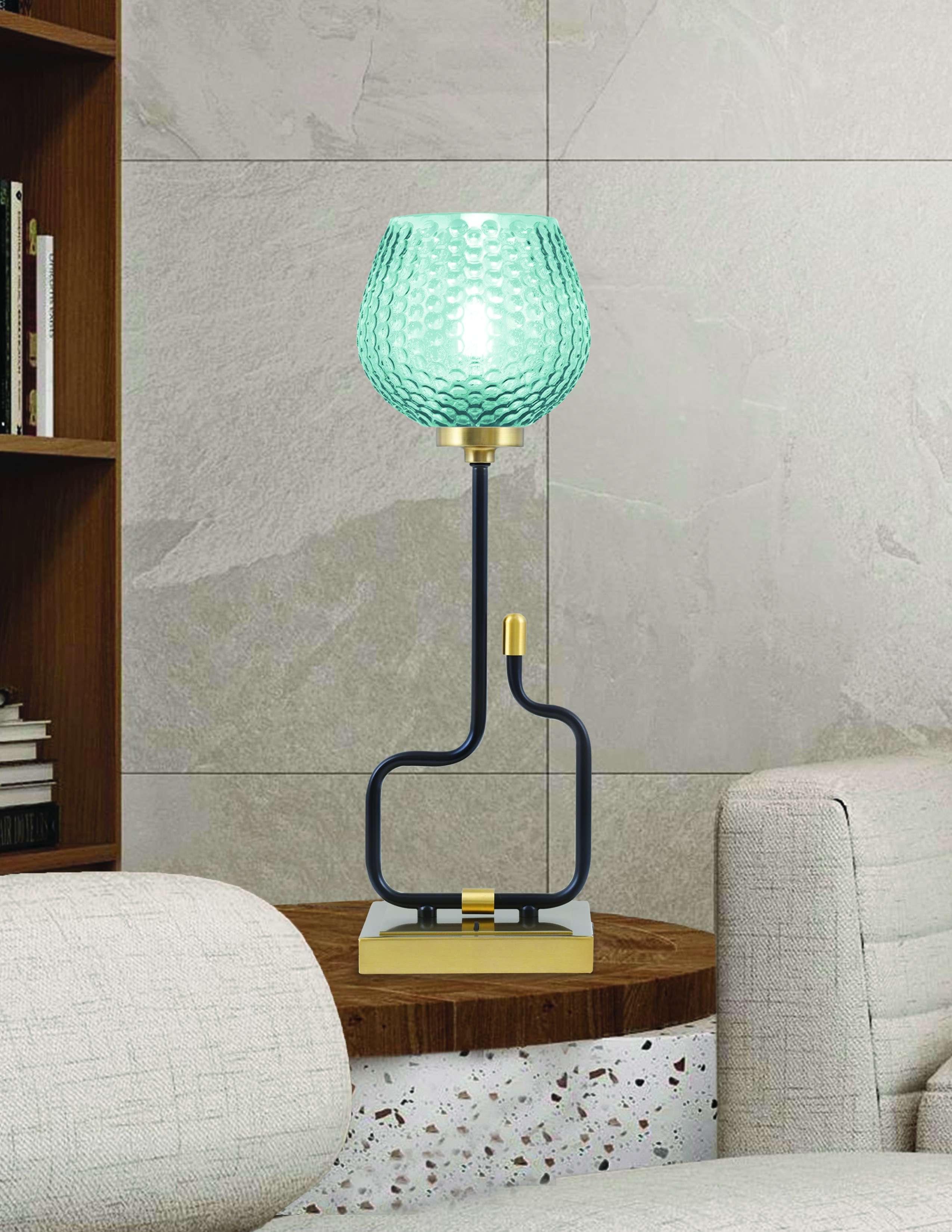 Infuse your space with a vibrant touch of artistry and sophistication with the Sandia Accent Lamp. Featuring a sleek Matte Black and New Age Brass finish, this lamp delivers a striking visual contrast. The 6″ turquoise textured glass shade brings a bold pop of color and a soft, inviting glow, making it a stunning centerpiece for any room.