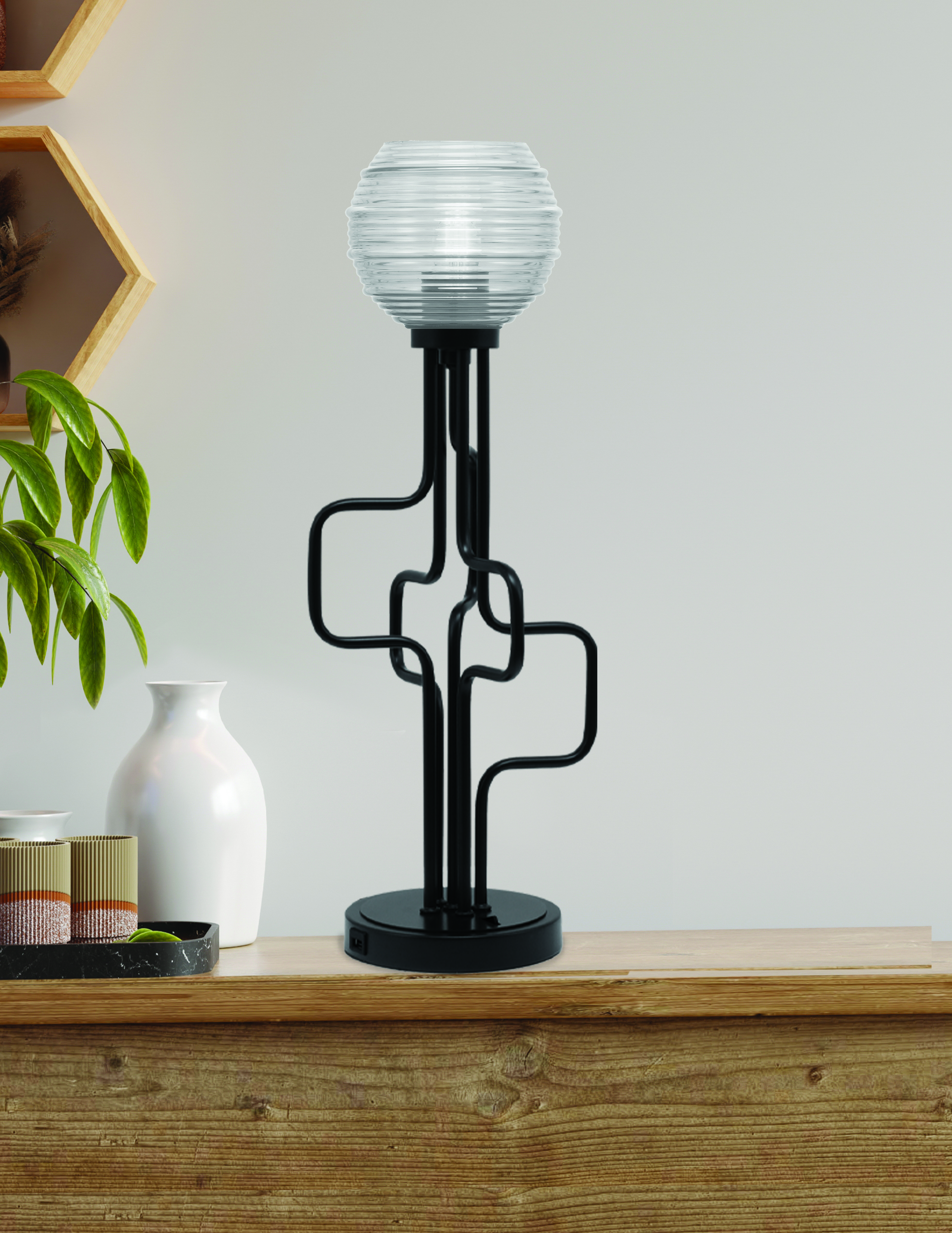 Toltec Lighting 62-MB-5110 Sandia Accent Lamp, With USB Ports, Matte Black Finish, 6″ Clear Ribbed Glass