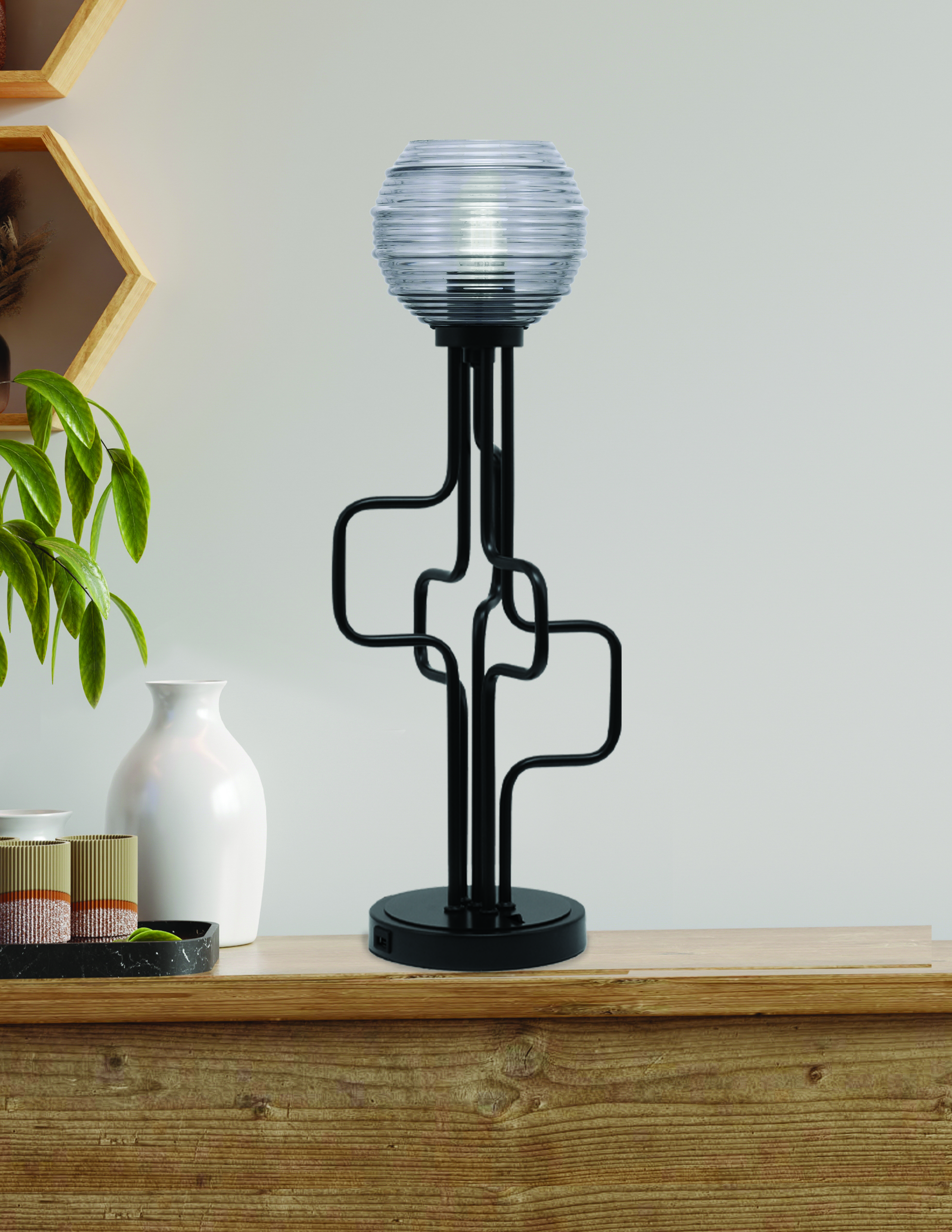 Toltec Lighting 62-MB-5112 Sandia Accent Lamp, With USB Ports, Matte Black Finish, 6″ Smoke Ribbed Glass