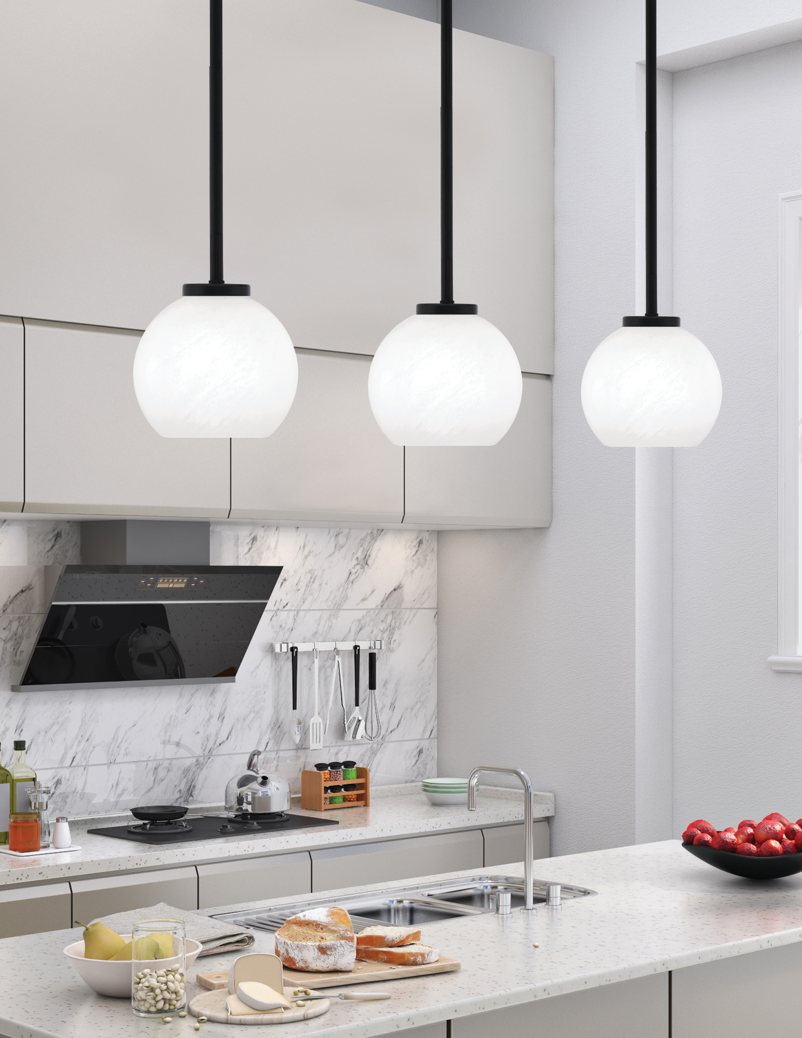 Introducing The Sandia 1 Light Stem Mini Pendant, A Perfect Blend Of Contemporary Design And Timeless Elegance. This Exquisite Pendant Features A Striking Matte Black Finish That Compliments The Beautifully Crafted 5.75″ White Marble Glass Shade. Ideal For Any Space, This Mini Pendant Provides A Warm Glow While Adding A Touch Of Sophistication To Your Home Decor.