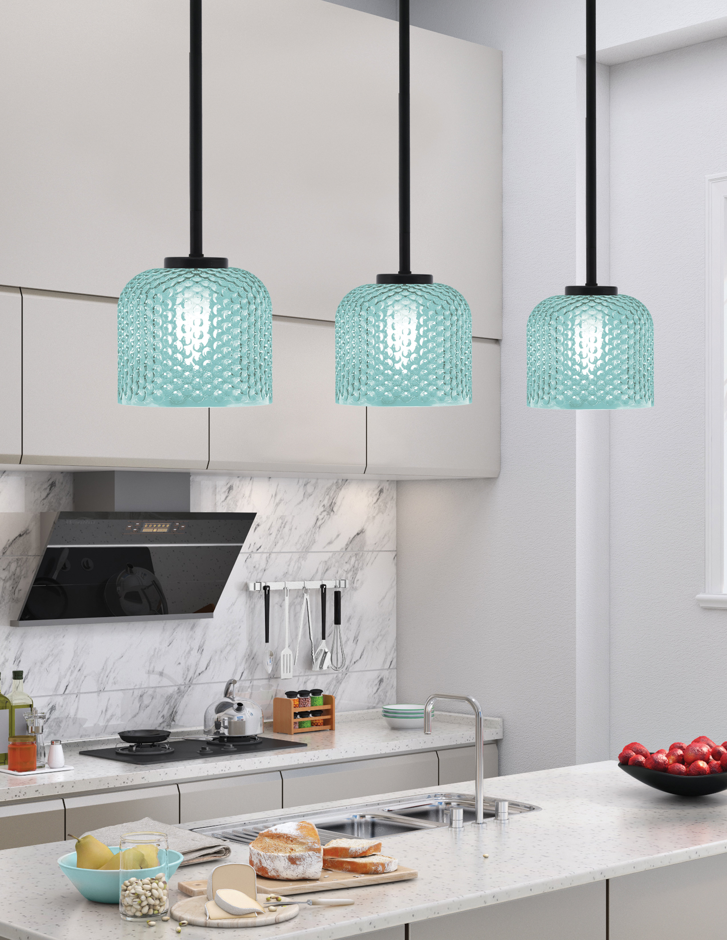 Introducing the Sandia 1 Light Stem Mini Pendant, a Stunning Addition to any Modern Space. Featuring a Chic Matte Black Finish, this Pendant Exudes Sophistication while Showcasing the Unique 6″ Turquoise Textured Glass Shade. Illuminate your Home with a Touch of Elegance and Vibrant Color, Perfect for Creating a Warm and Inviting Atmosphere.