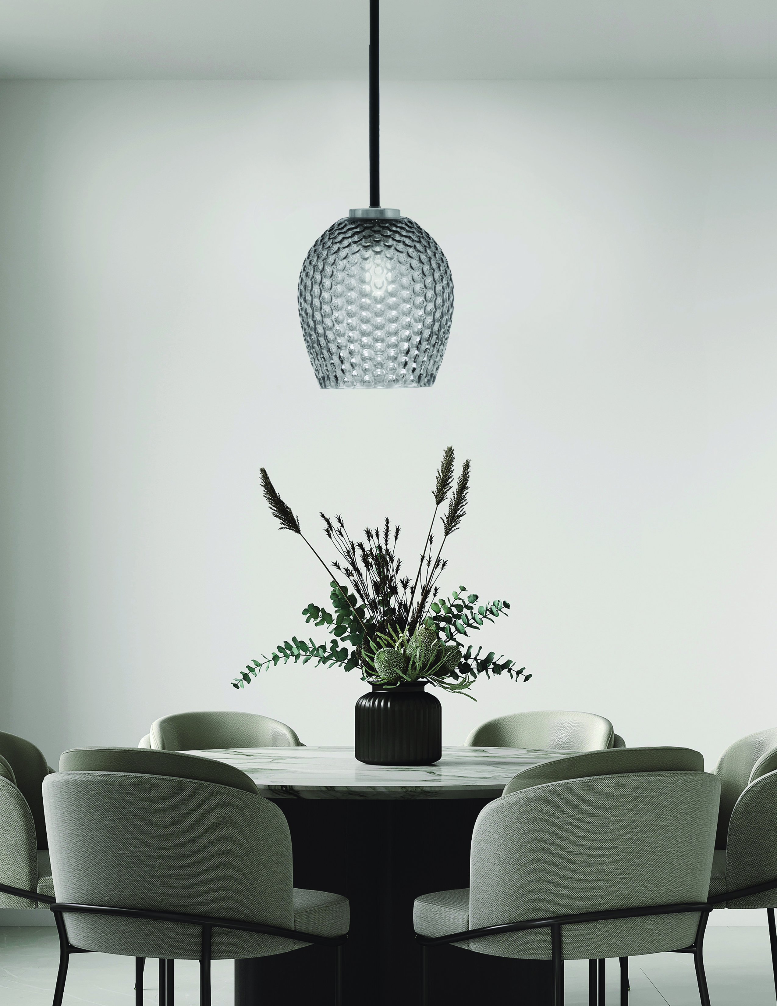 Introducing the Sandia 1 Light Stem Mini Pendant, a Stunning Addition to Any Modern Space. Featuring a Stylish Matte Black & Graphite Finish, this Pendant Light Exudes Sophistication and Elegance. The Unique 7.5″ Smoke Textured Glass Creates a Beautiful Ambient Glow, Perfect for Enhancing Your Home Decor.