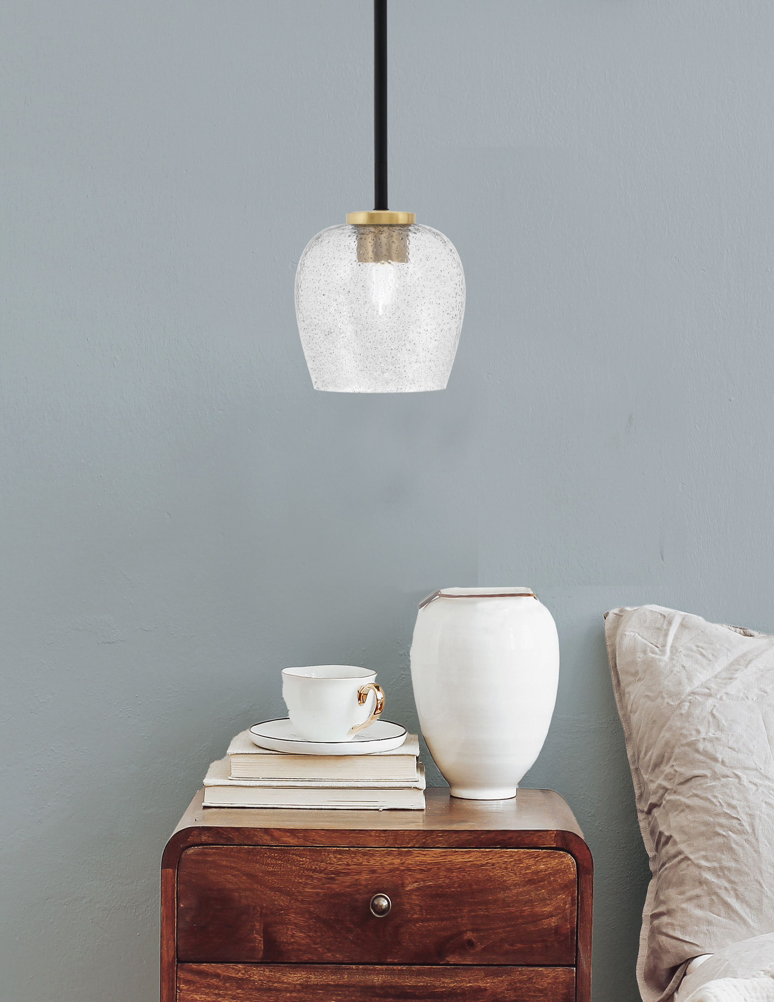 Introducing the Sandia 1 Light Stem Mini Pendant, a Striking Addition to Any Space. With its Stunning Matte Black and New Aged Brass Finish, this Pendant Combines Modern Elegance with Vintage Charm. The 6″ Smoke Bubble Glass Creates a Soft, Diffused Glow, Perfect for Enhancing the Ambiance of Your Home.