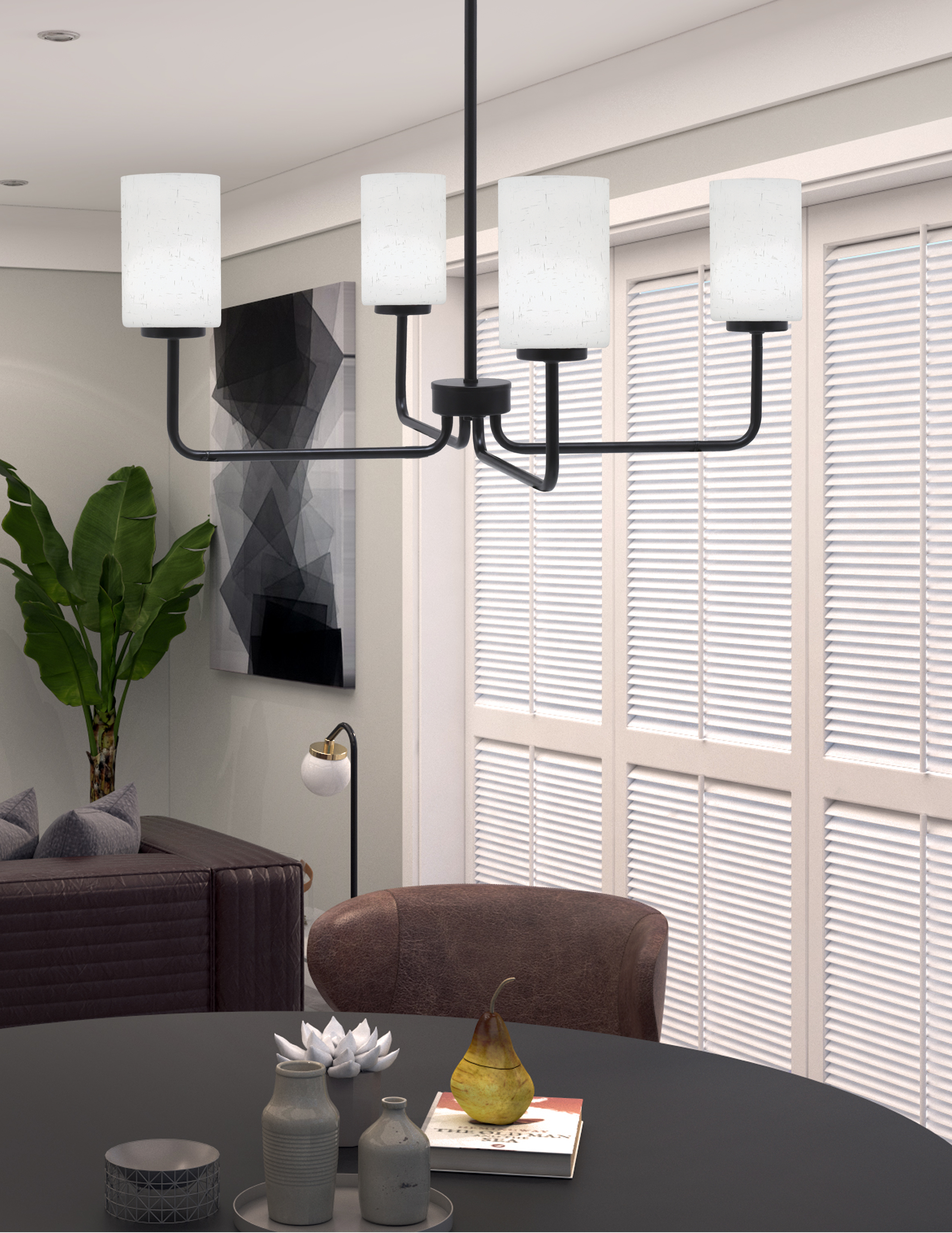 Elevate your home’s ambiance with the Sandia 4-Light Chandelier, featuring a modern Matte Black Finish complemented by 4-inch White Muslin Glass shades. The 4-inch White Muslin Glass adds a touch of refinement, ensuring the chandelier’s design is both versatile and balanced. This chandelier blends sleek design with understated elegance, making it an ideal centerpiece for dining rooms, entryways, or living spaces.