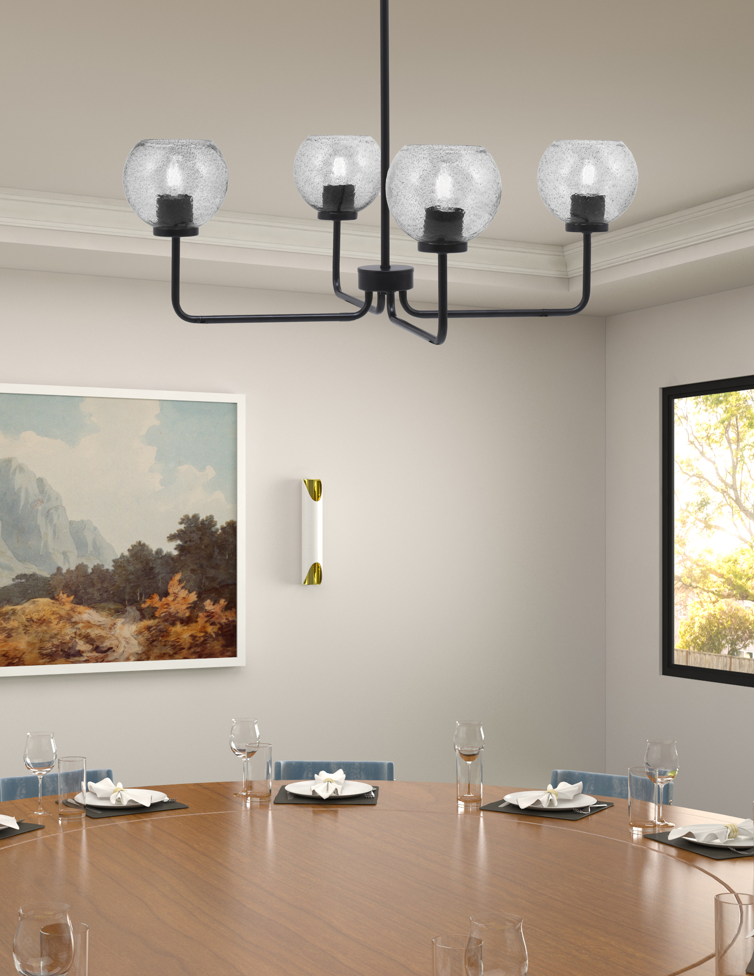 Add a touch of modern sophistication to your home with the Sandia 4 Light Chandelier. Finished in sleek matte black, this chandelier makes a bold design statement. The 5.75″ smoke bubble glass shades steal the show with their textured beauty, creating a dramatic and captivating lighting effect.