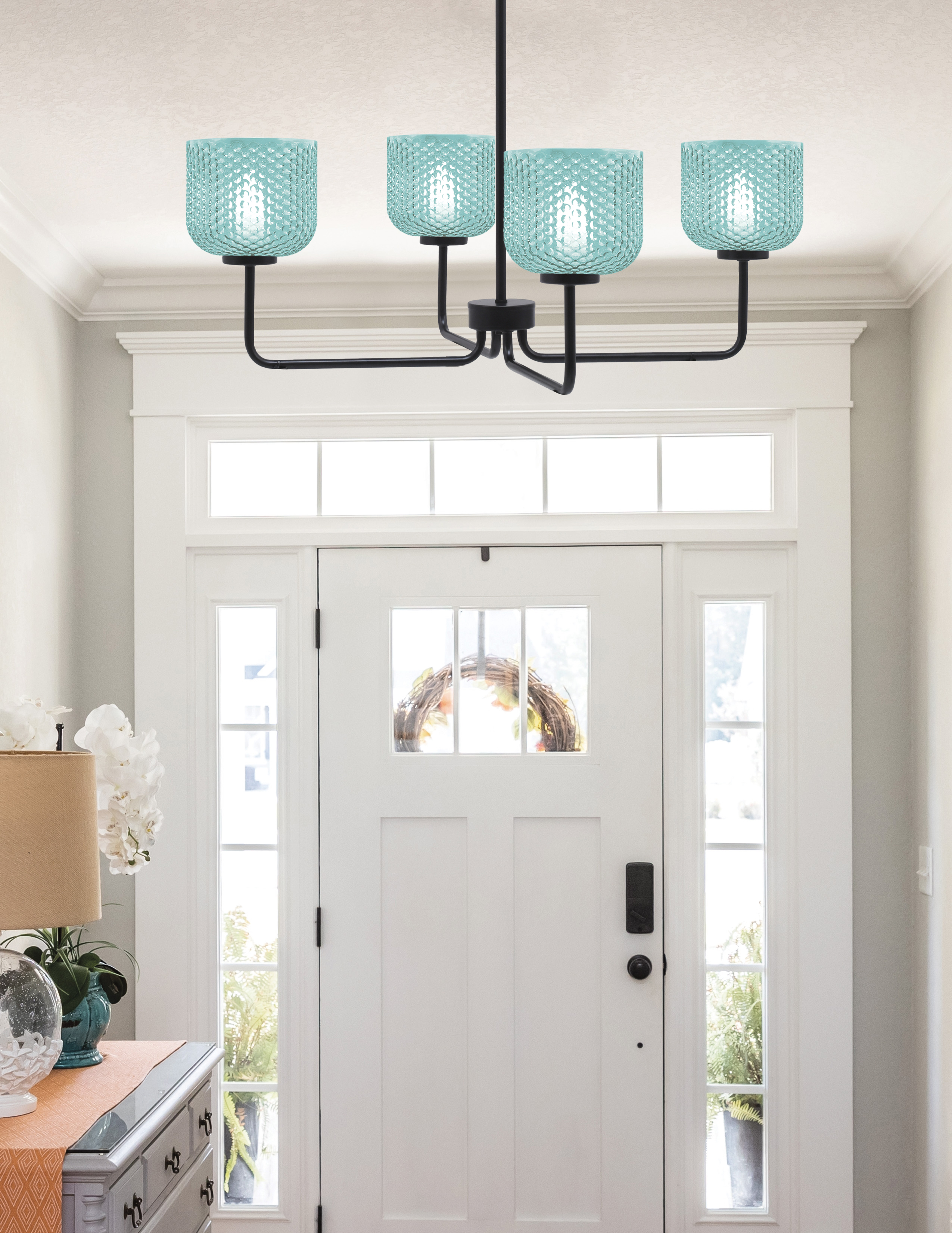 Infuse your space with vibrant color and modern sophistication with the Sandia 4 Light Chandelier. Featuring a sleek matte black finish, this chandelier offers a striking contrast against its vibrant turquoise textured glass shades. Making it a perfect choice for contemporary and eclectic interiors.