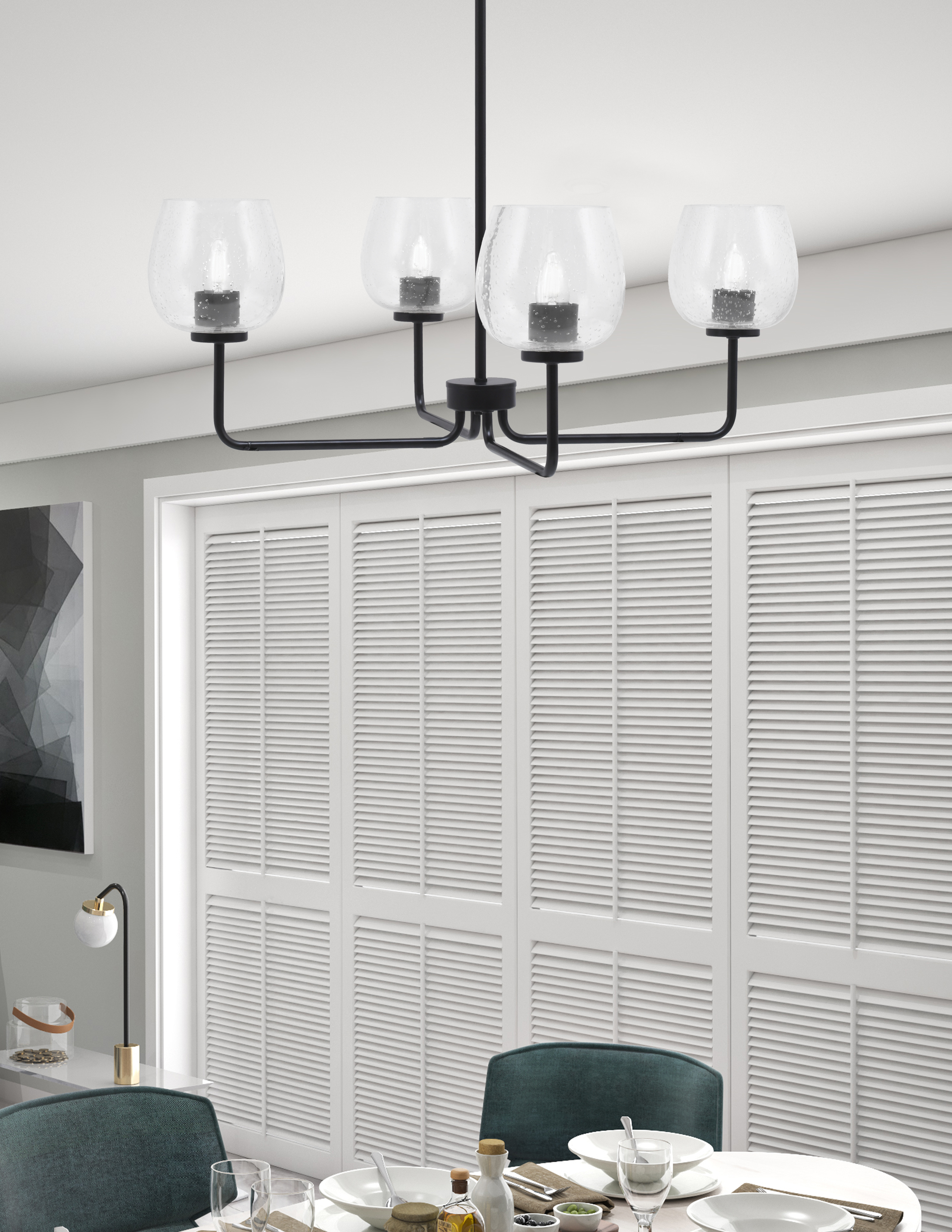 Elevate your home’s interior with the contemporary style and timeless appeal of the Sandia 4 Light Chandelier. Featuring a matte black finish, this chandelier provides a sleek and bold foundation that beautifully contrasts with the clear bubble glass shades. When lit, the 6″ clear bubble glass shades create an intriguing visual effect, diffusing light in a soft and ambient way that fills the room with warmth and elegance.