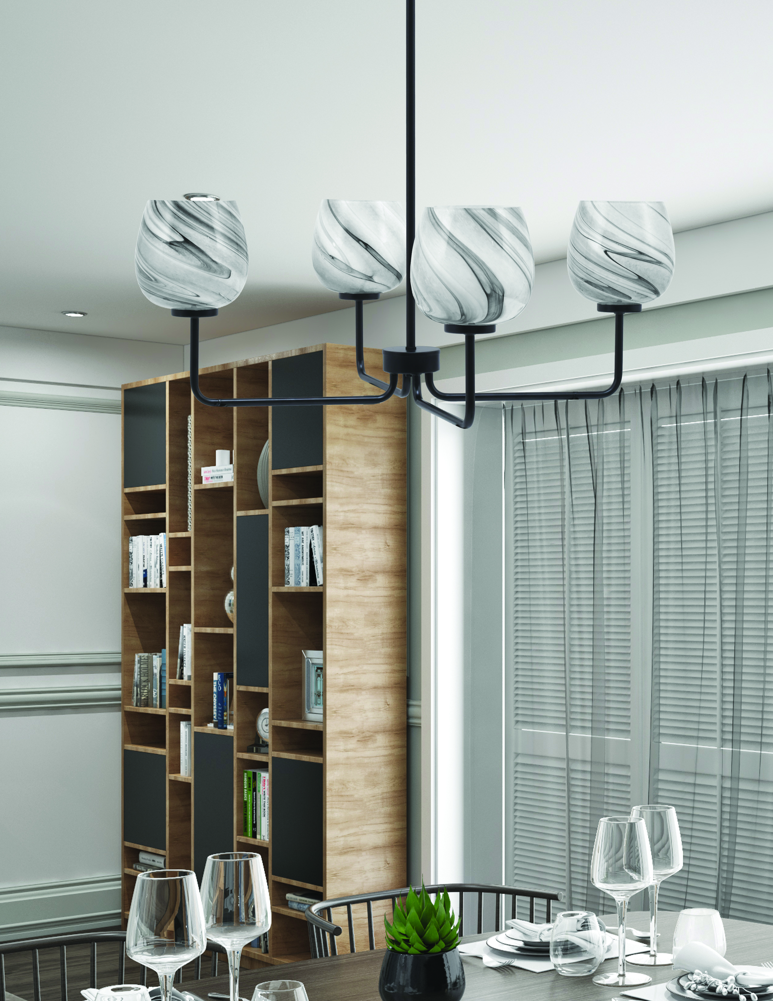 Bring modern sophistication and a touch of artistic flair to your home with the Sandia 4 Light Chandelier. The sleek matte black finish provides a bold contrast to the striking 6″ onyx swirl glass shades, making it a perfect centerpiece for any contemporary or transitional space. This intricate design creates a dramatic and textured appearance, while the glass gently diffuses light, providing a warm, ambient glow.