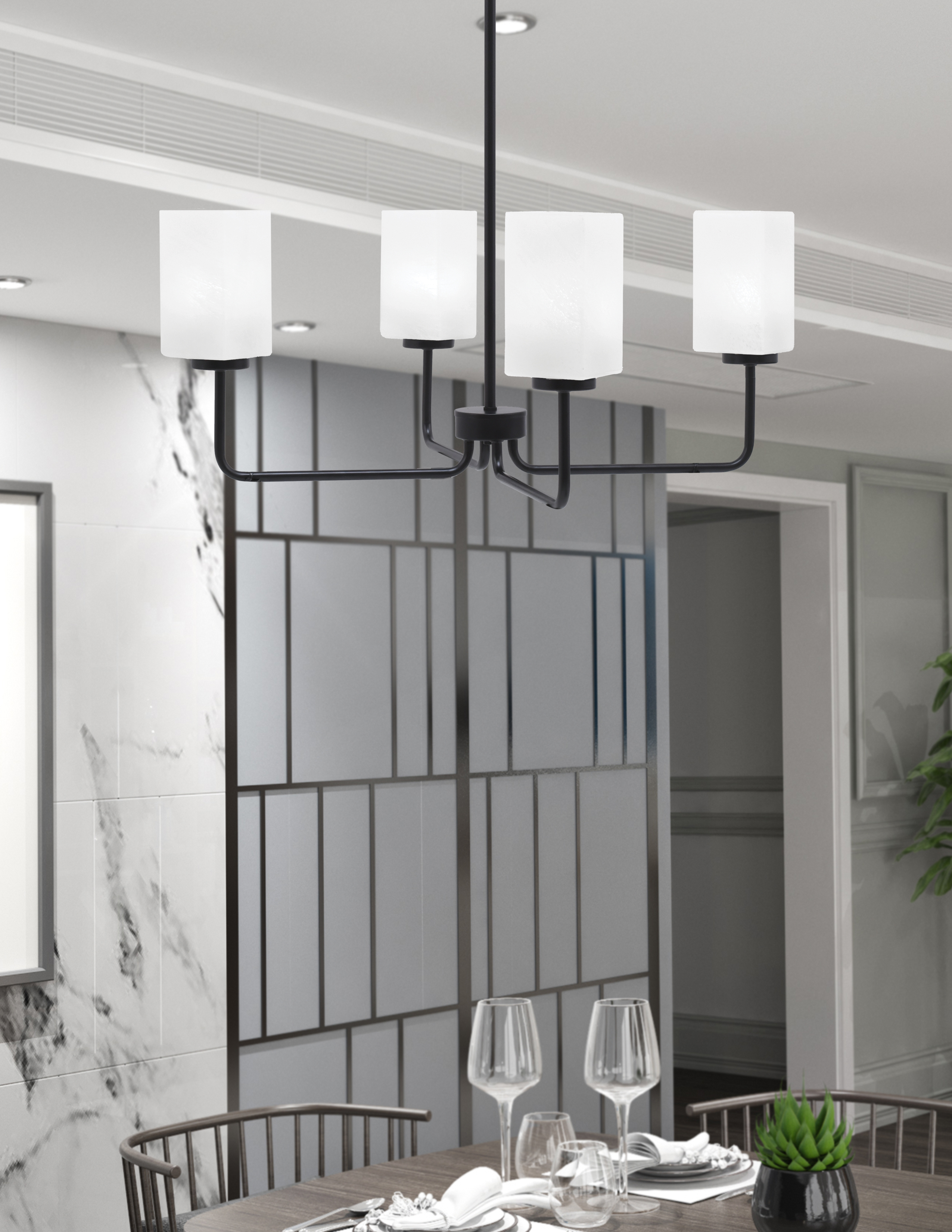 Bring modern sophistication to your home with the Sandia 4-Light Chandelier, featuring a sleek Matte Black Finish and elegant 3.5-inch Square White Marble Glass shades. The Square White Marble Glass shades showcase a stunning marble-like pattern that diffuses light softly, adding a touch of luxury and warmth to your decor. This chandelier combines clean lines with refined materials, making it a stylish addition to your space.