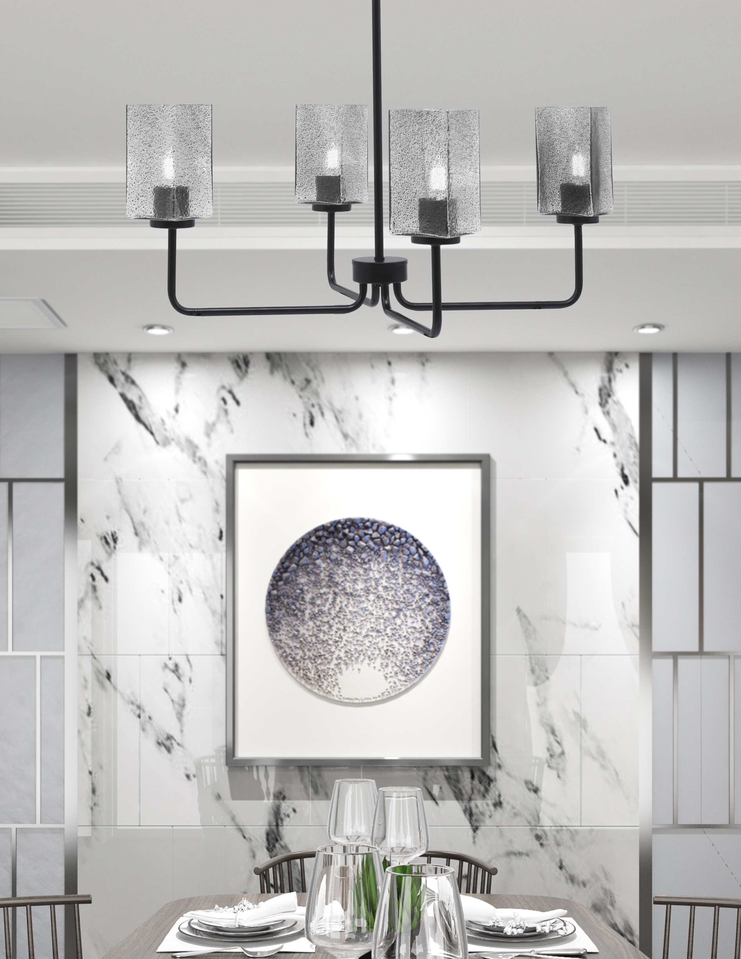 Elevate your interior with the striking design of the Sandia 4-Light Chandelier. Featuring a bold Matte Black Finish and 3.5-inch Square Smoke Bubble Glass shades. This chandelier seamlessly blends modern style with artistic charm, making it an ideal centerpiece for dining rooms, entryways, or living spaces.