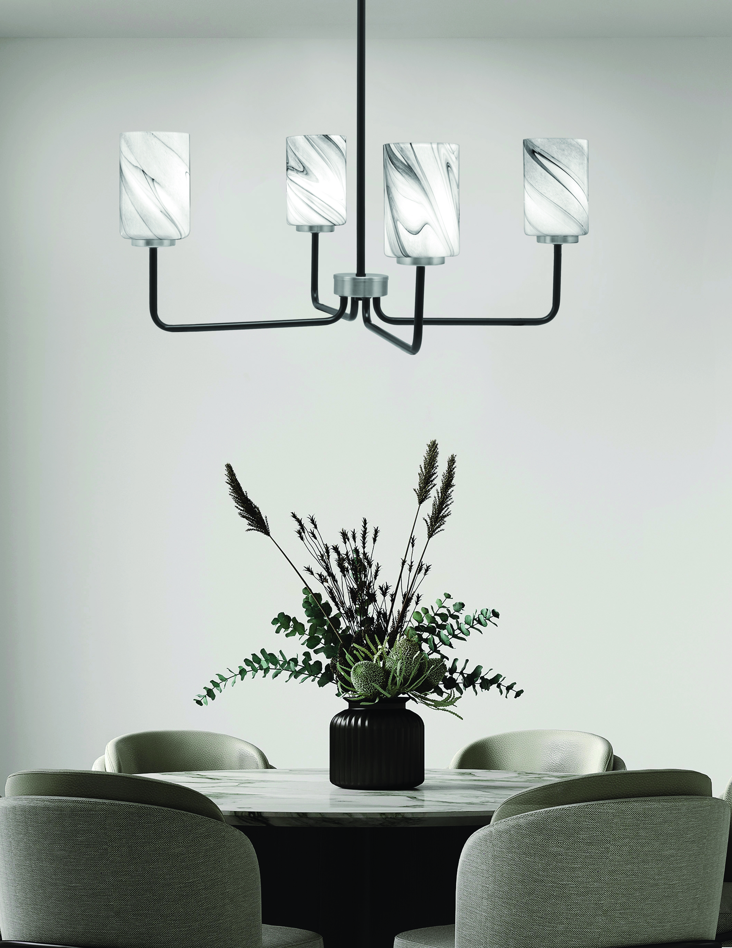 The Sandia 4 Light Chandelier blends contemporary sophistication with industrial style. Its matte black and graphite finish offers a sleek, modern look, while four 4″ onyx swirl glass shades add a touch of artistry. The unique swirl pattern within the onyx glass creates a captivating light display, diffusing light in a soft and inviting way.