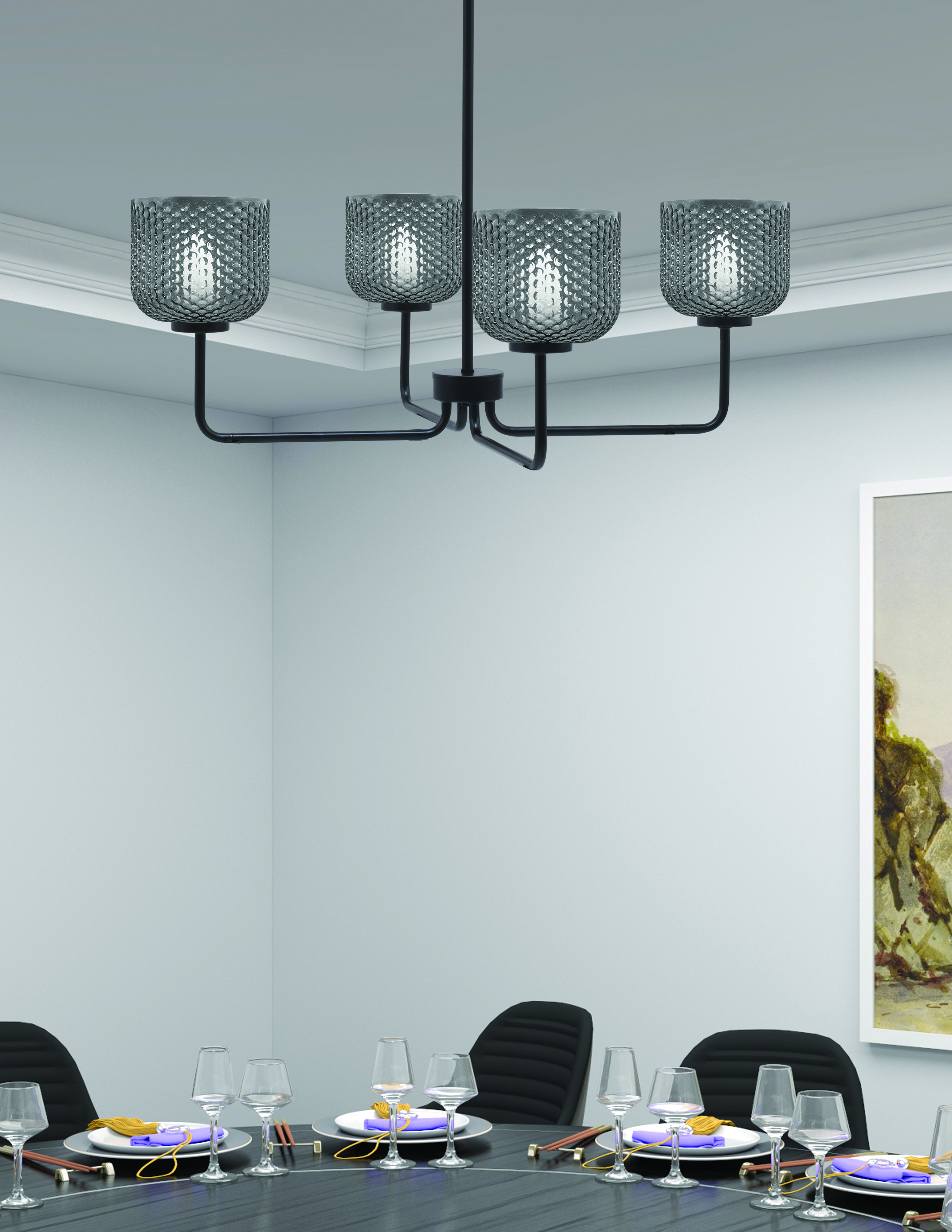 The Sandia 4 Light Chandelier brings industrial elegance and modern sophistication into your home. With a sleek matte black and graphite finish, this chandelier creates a stunning contrast against the four 6″ smoke textured glass shades. The textured glass casts a soft, smoky glow that gently illuminates your space, adding warmth and ambiance.