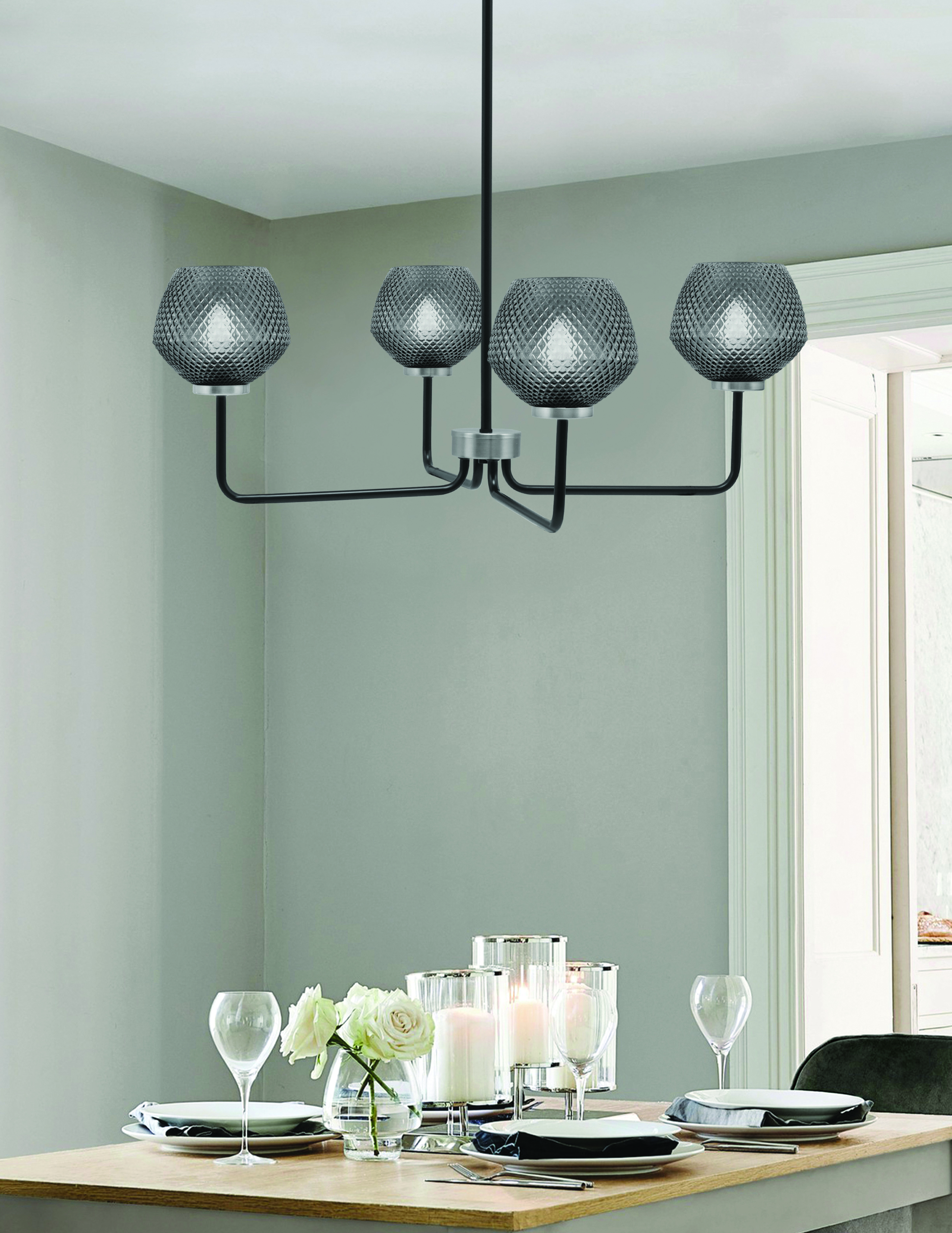 The Sandia 4 Light Chandelier offers a bold, contemporary look with its matte black and graphite finish. The four 6″ smoke textured glass shades create a beautifully diffused, smoky glow that adds warmth and ambiance to any space. The textured glass design casts dynamic light patterns, making this chandelier not only a source of illumination but also a stunning visual centerpiece.