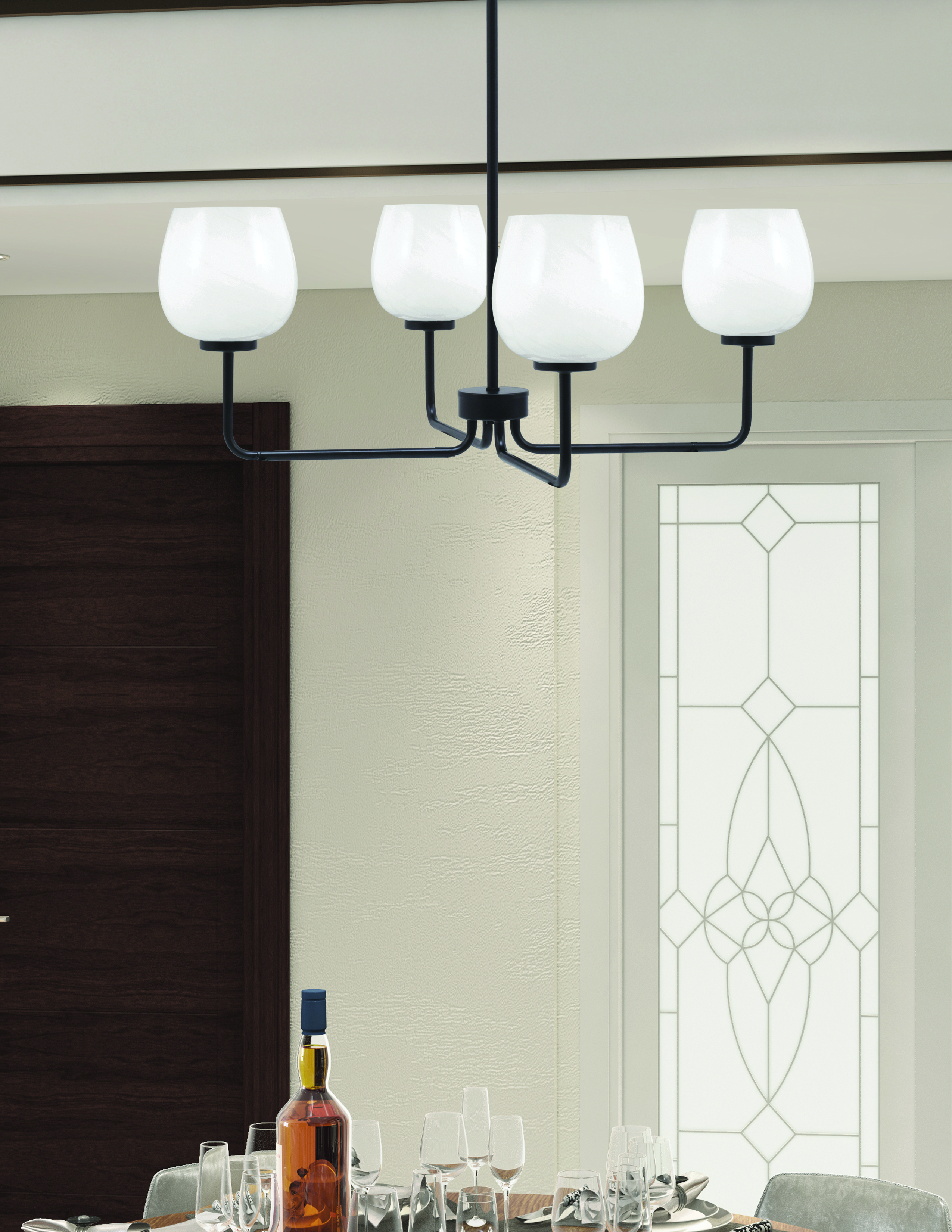 The Sandia 4 Light Chandelier effortlessly combines modern style with luxurious finishes. Its sleek matte black and graphite finish enhances the contemporary design, while the four 6″ white marble glass shades bring a touch of sophistication. This chandelier is a standout piece that will complement various decor styles.