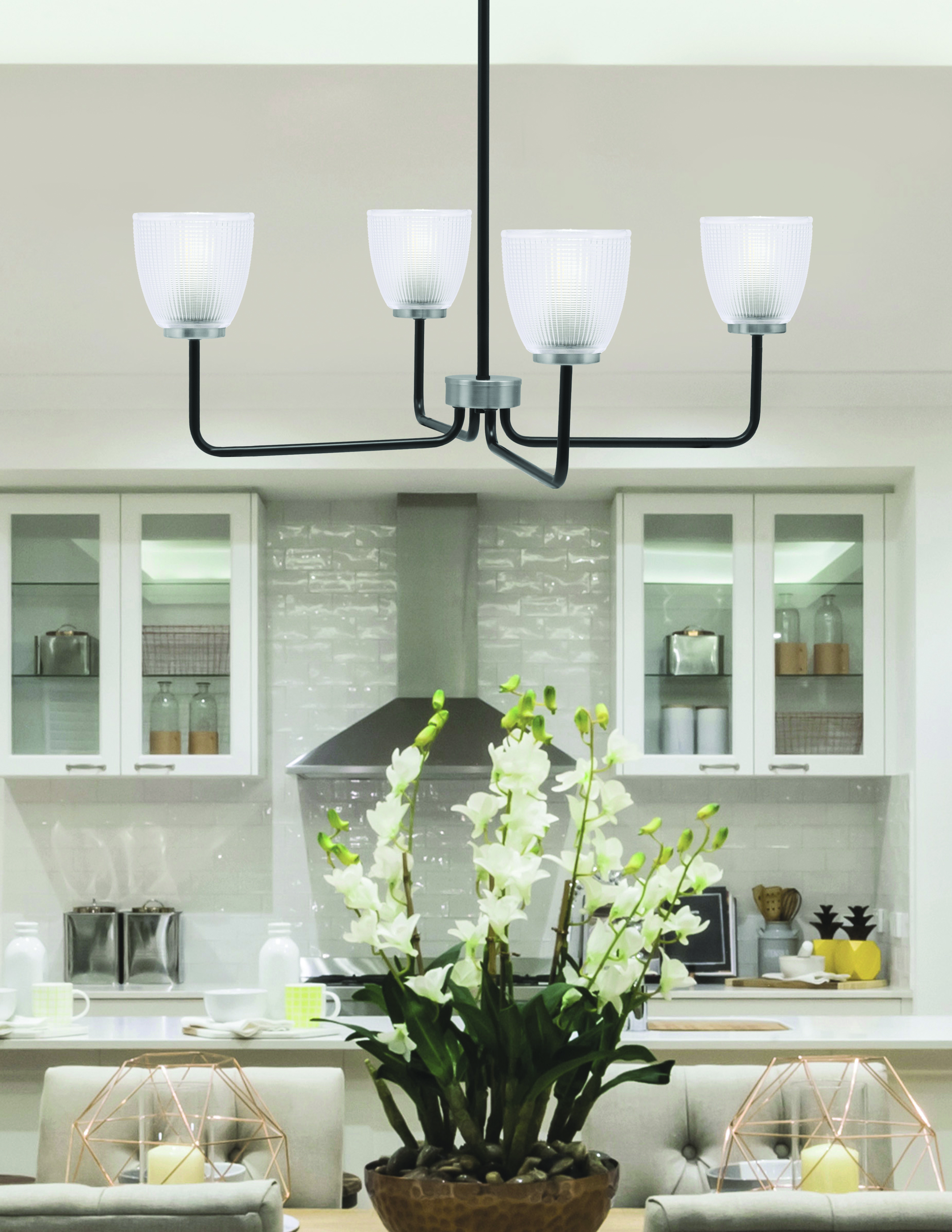 Elevate your lighting with the Sandia 4 Light Chandelier, a striking fusion of modern sophistication and industrial charm. The matte black and graphite finish offers a bold contrast, while four 5″ clear ribbed glass shades create a dynamic interplay of light and texture. The ribbed glass design enhances light diffusion, casting an elegant glow throughout your space.
