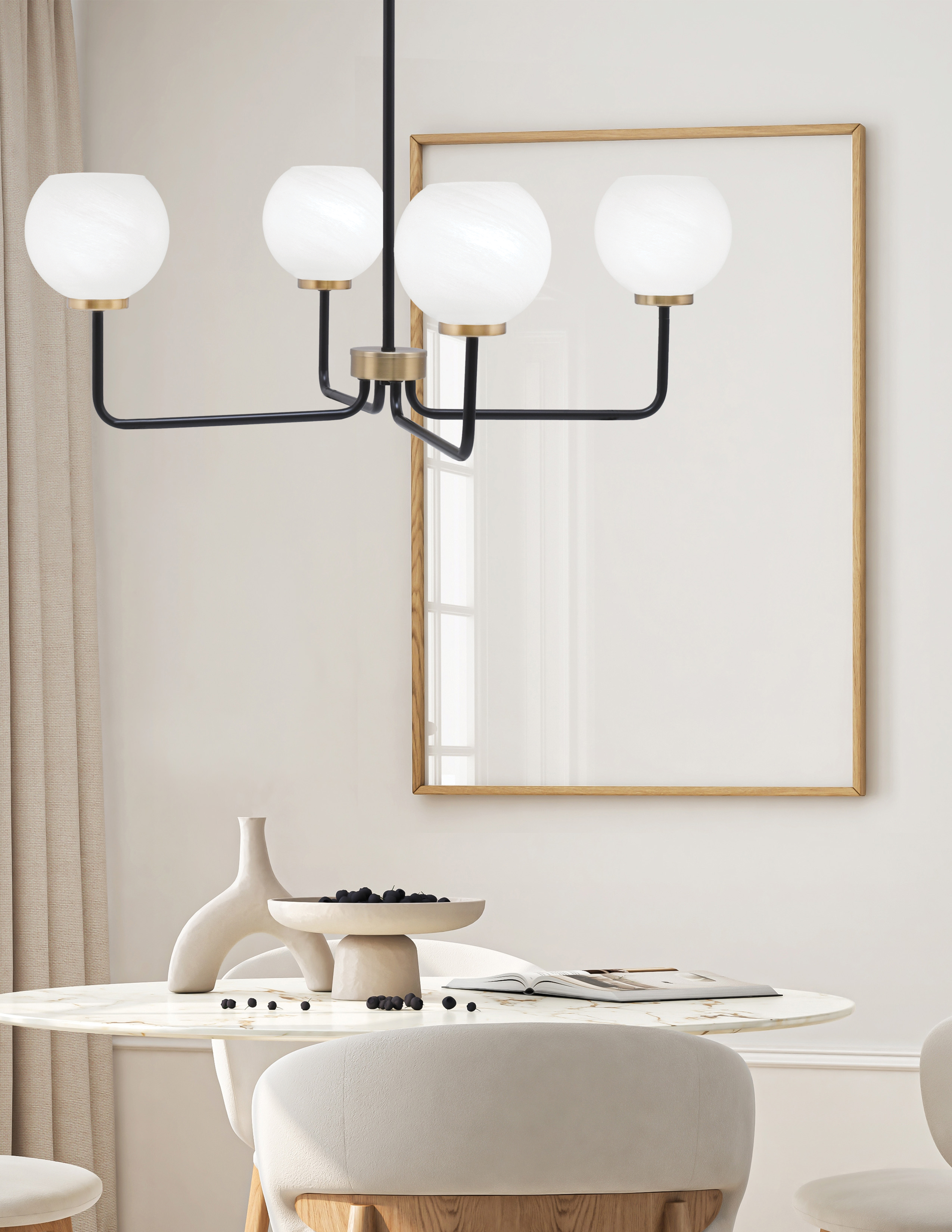 The Sandia 4 Light Chandelier with white marble glass is a perfect choice for those seeking a sophisticated lighting fixture that adds both beauty and function to their home. The 5.75″ white marble glass shades are expertly crafted to offer a soft, diffused light while showcasing subtle veining for added texture and depth. Featuring a bold Matte Black finish contrasted with the warm, luxurious glow of New Age Brass accents, this chandelier brings an air of refined beauty to any room.