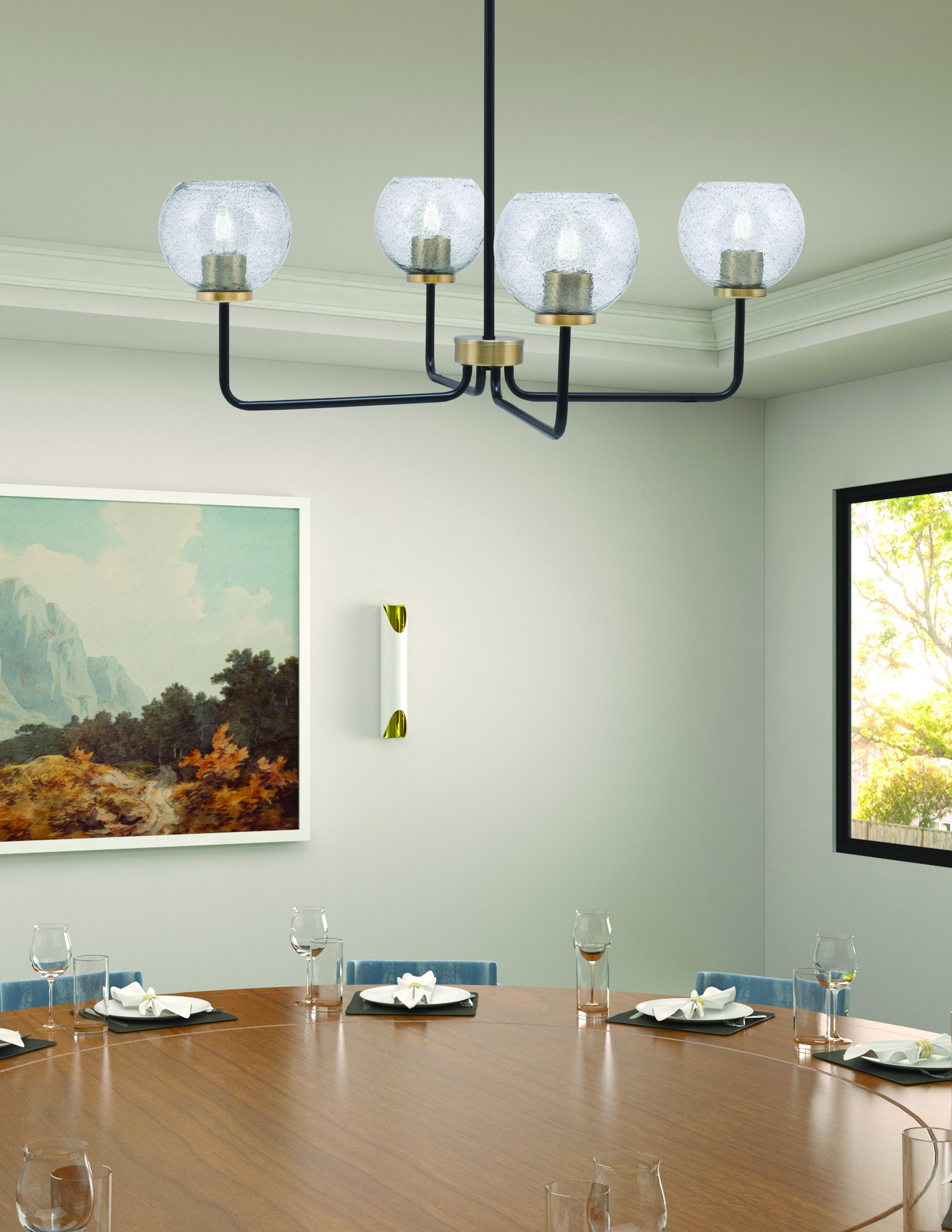 Bring a touch of elegance and artistry to your home with the Sandia 4 Light Chandelier. The striking Matte Black finish is paired with the warm glow of New Age Brass accents, creating a modern and sophisticated aesthetic. The 5.75″ smoke bubble glass shades add texture and visual interest, with their unique bubble patterns diffusing light in a beautiful, enchanting way.