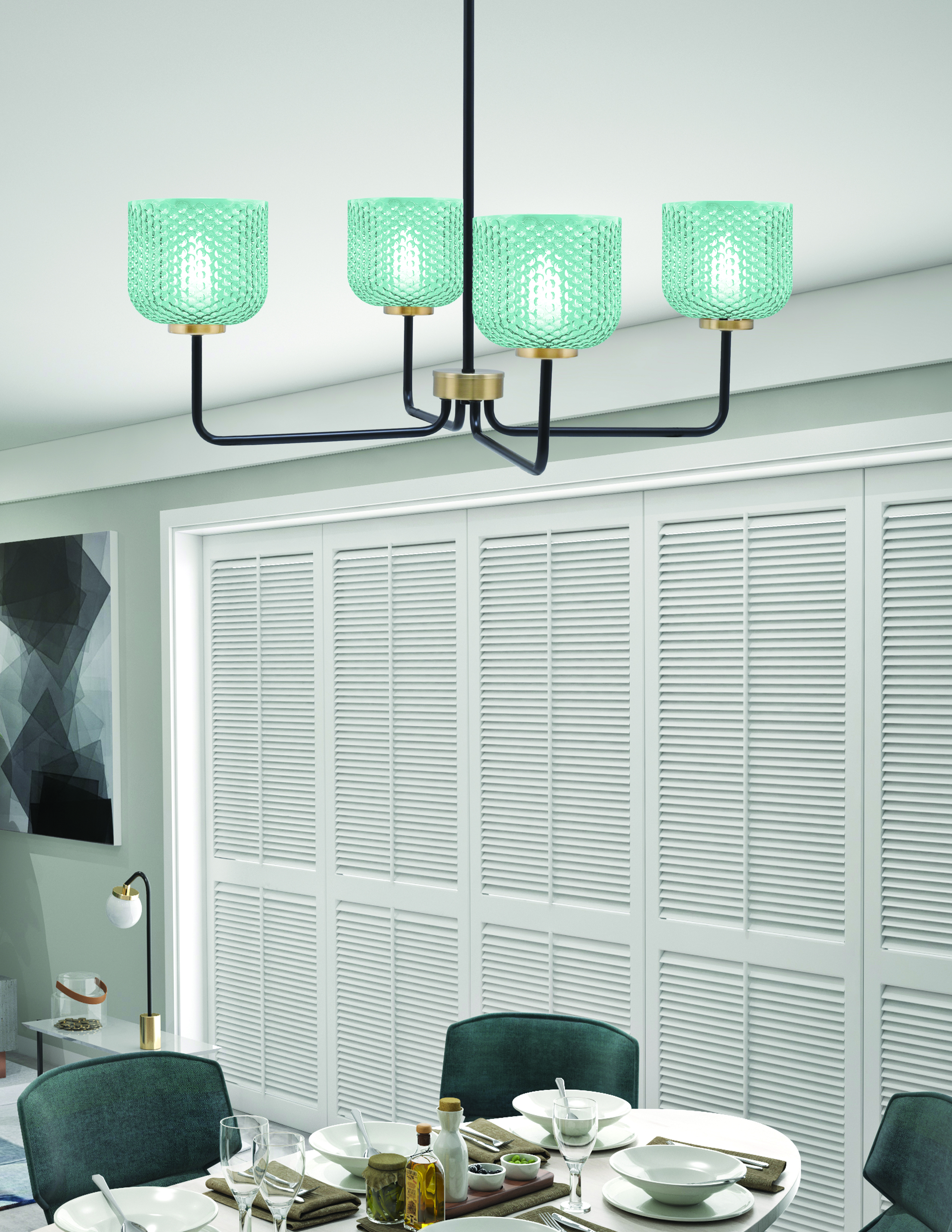 Transform your space with the bold and sophisticated design of the Sandia 4-Light Chandelier. Featuring a stunning combination of Matte Black and New Age Brass Finishes, this fixture exudes contemporary charm with a touch of luxury. Its four lights are beautifully complemented by 6″ Turquoise Textured Glass shades, adding a vibrant pop of color and a unique texture to your decor.