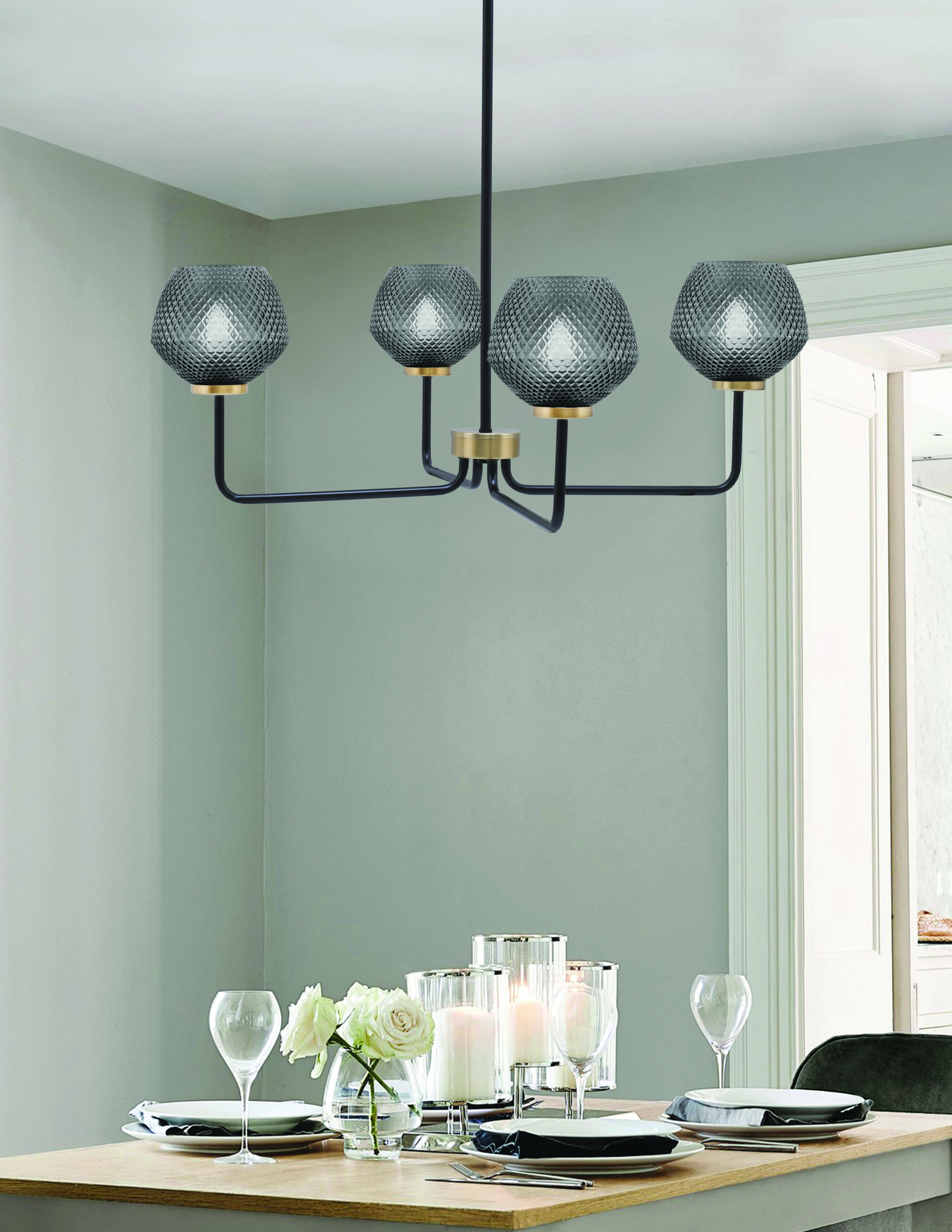 Add a touch of modern sophistication to your space with the Sandia 4-Light Chandelier. Featuring a sleek combination of Matte Black and New Age Brass Finishes, this fixture seamlessly blends contemporary elegance with timeless design. The four lights are adorned with 6″ Smoke Textured Glass shades, offering a refined aesthetic while softly diffusing the light to create a warm and inviting ambiance.