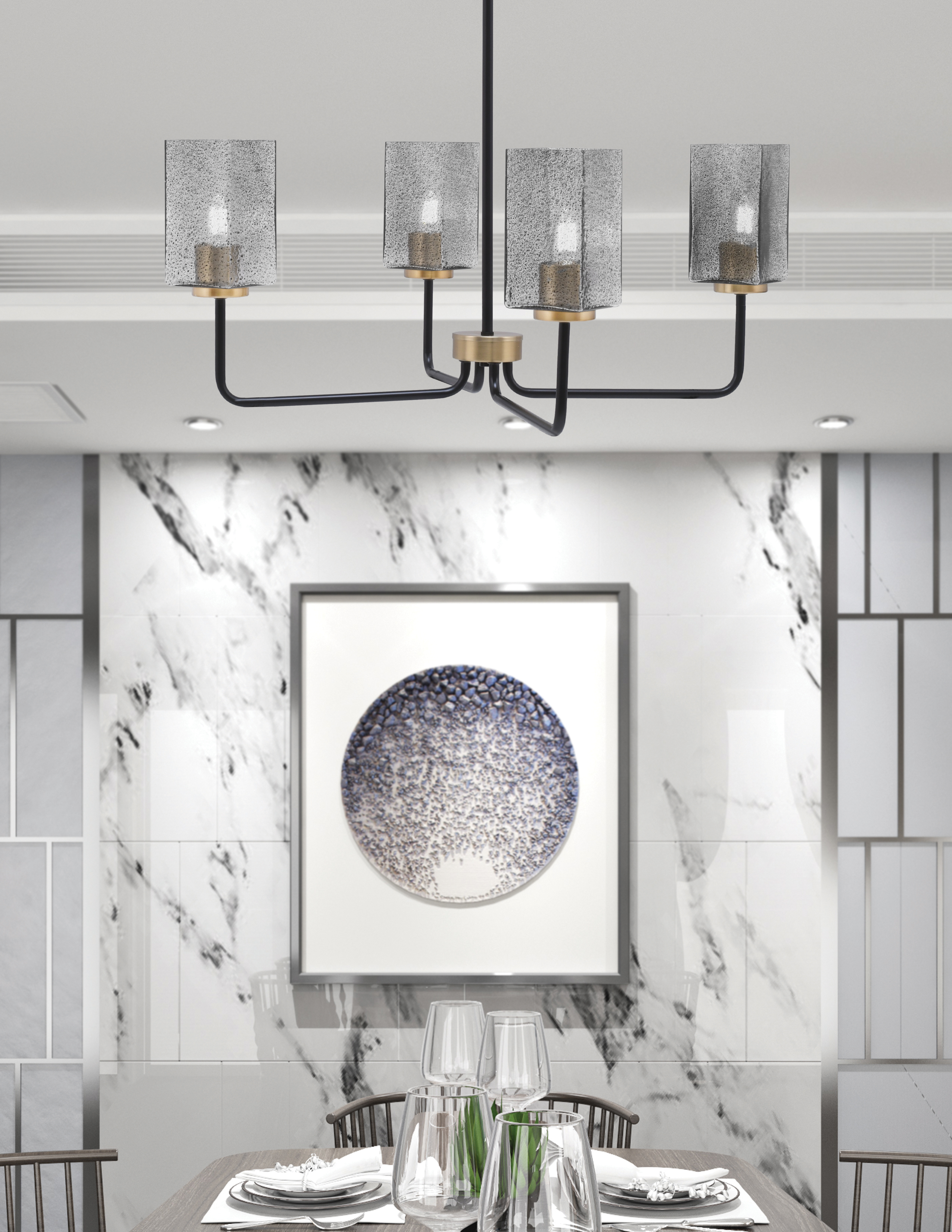 Infuse your home with contemporary elegance and a touch of industrial charm with the Sandia 4 Light Chandelier. Featuring a bold Matte Black finish paired with luxurious New Age Brass accents, this chandelier showcases a perfect blend of modern sophistication and timeless appeal. The 3.5″ square smoke bubble glass shades add texture and depth to the design, creating a visually captivating fixture that casts a warm, inviting glow.