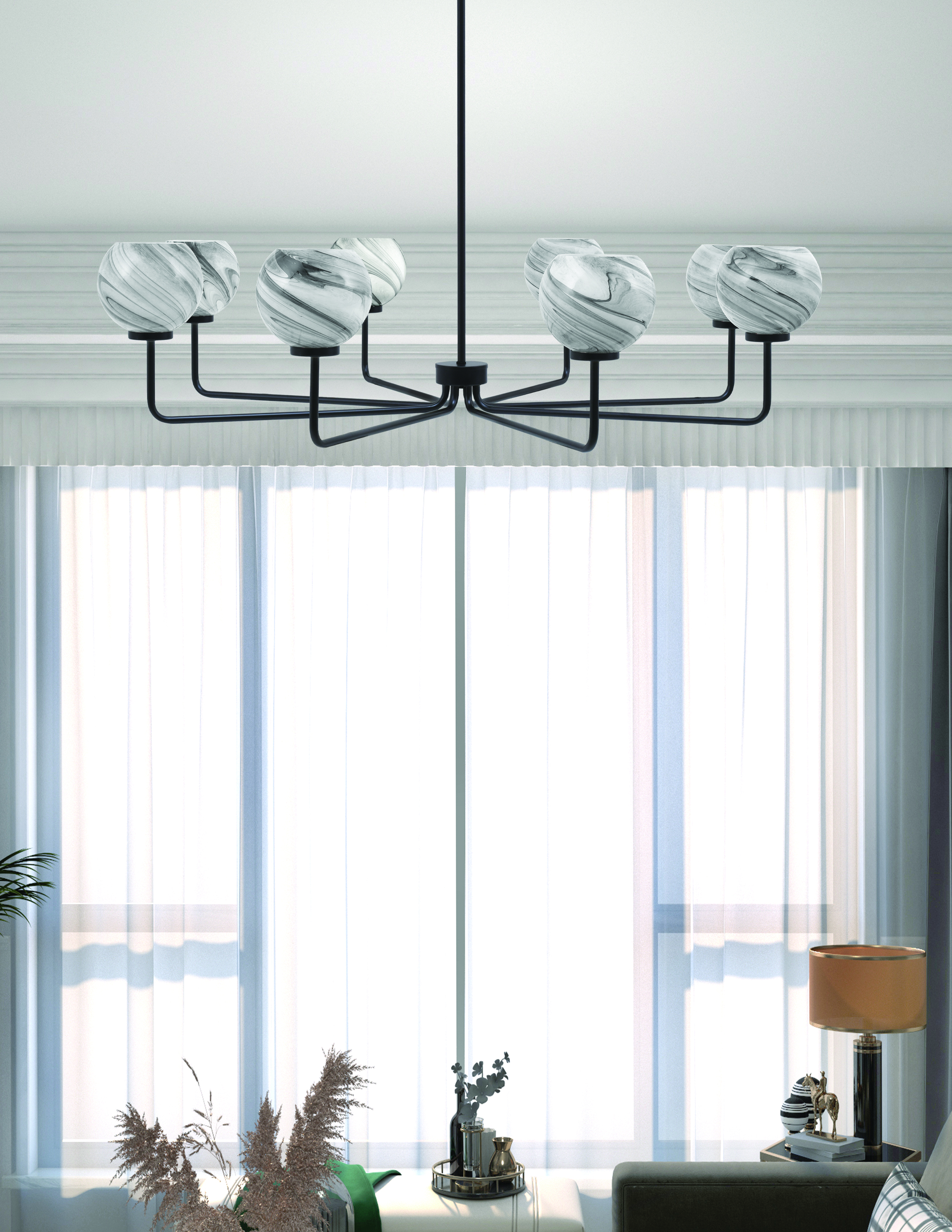 Add a touch of contemporary sophistication to your space with the Sandia 6 Light Chandelier. Featuring a bold matte black finish, this chandelier showcases 5.75″ onyx swirl glass shades that bring a dynamic visual appeal. The unique swirling patterns in the onyx swirl glass not only create a mesmerizing texture but also enhance the glow of the lights, making it the perfect statement piece for your home.