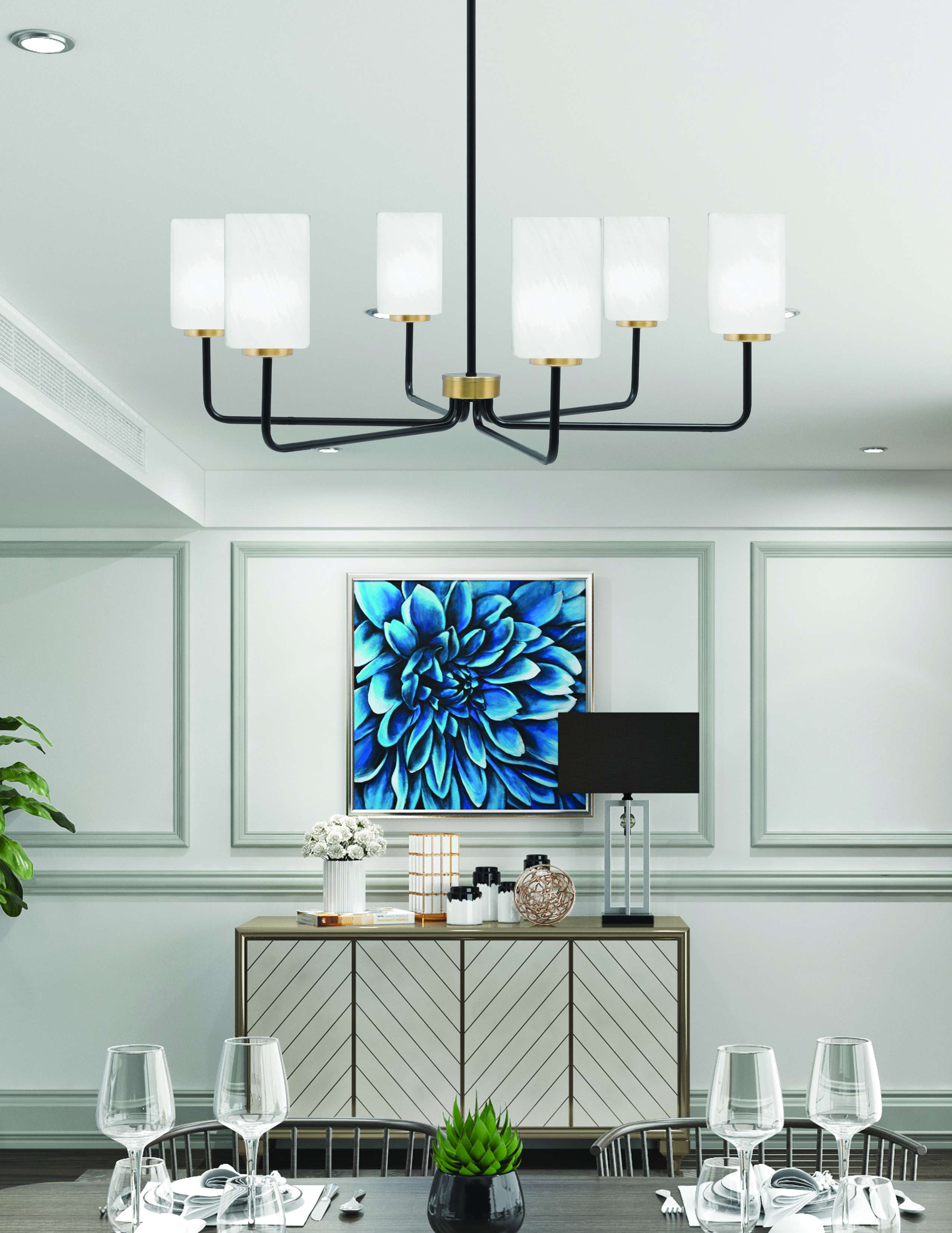 Transform your home with the Sandia 6 Light Chandelier, designed to be a centerpiece of style and functionality. The striking matte black finish paired with the sophisticated gleam of new age brass, offers a modern, upscale feel to any space. The chandelier features six 4″ white marble glass shades, each exuding timeless elegance with their soft white hue and refined marble-like texture, creating a sophisticated and harmonious look.