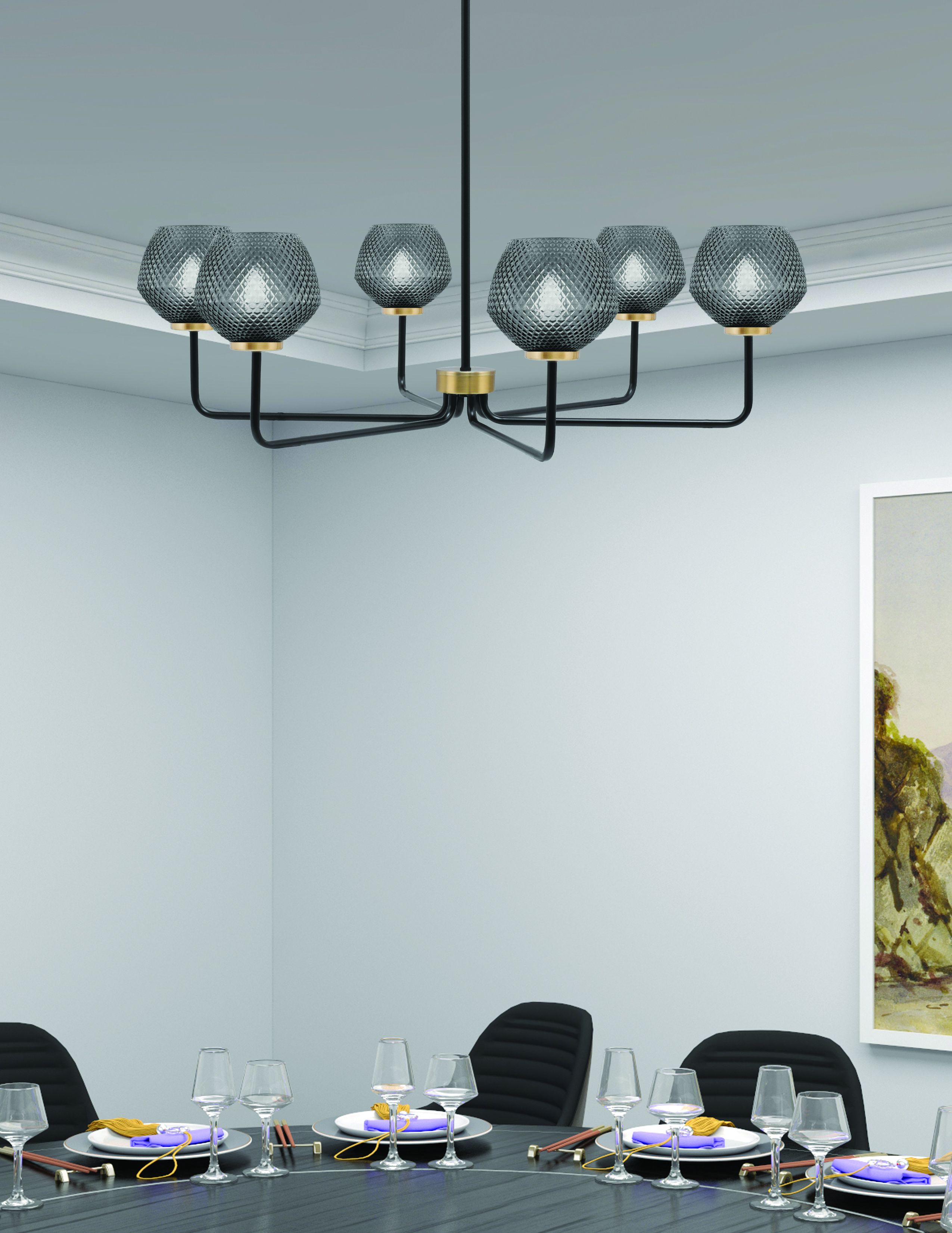 The Sandia 6 Light Chandelier seamlessly blends matte black and new age brass finishes, creating a stunning visual contrast that complements a range of modern and industrial interiors. The 6″ smoke textured glass shades add an intriguing depth, diffusing light in soft, shadowed tones while enhancing the overall ambiance. Ideal for large dining rooms, entryways, or living areas.