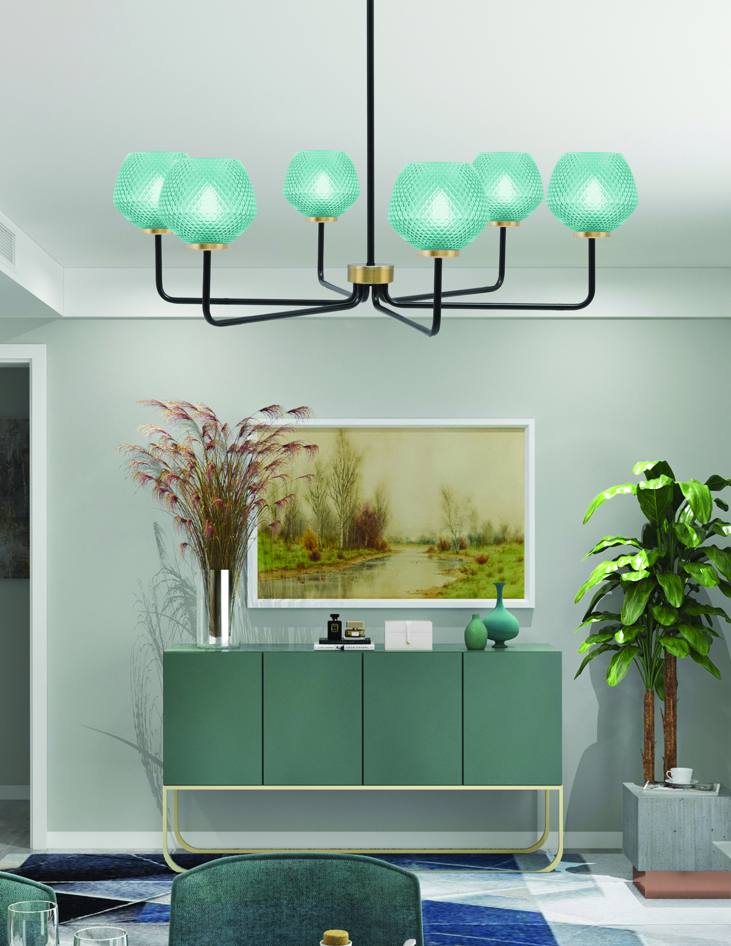 The Sandia 6 Light Chandelier combines a stunning matte black finish with luxurious new age brass accents, offering a striking modern aesthetic. The 6″ turquoise textured glass shades add a vibrant pop of color and texture, creating an eye-catching contrast that uplifts any space. This chandelier creates an inviting atmosphere with a touch of artistic flair.