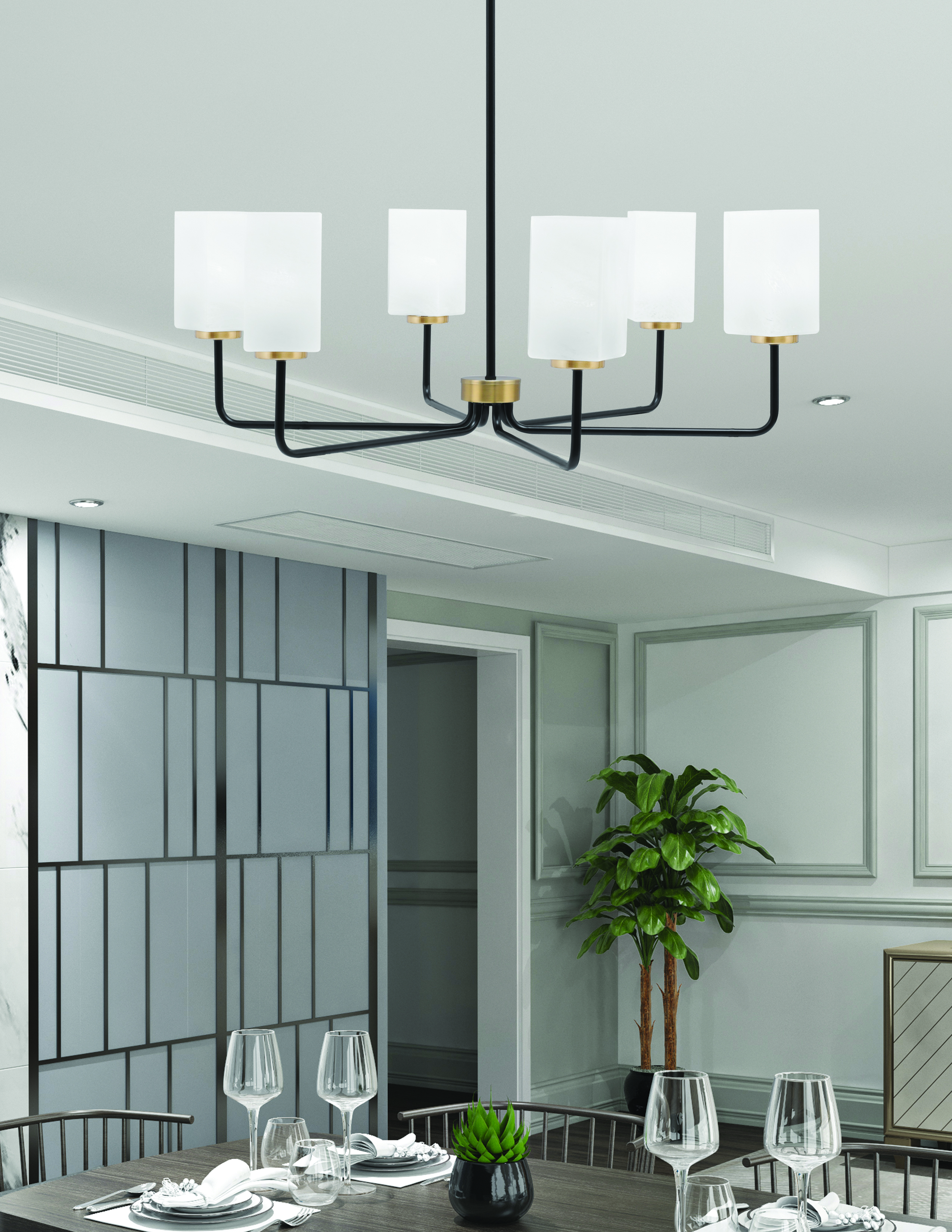 Transform your space with the sophisticated elegance of the Sandia 6 Light Chandelier. Featuring a stunning matte black finish and contrasting new age brass accents. This striking chandelier is complemented by six exquisite 3.5″ square white marble glass shades that bring an element of refined luxury and subtle texture to any room.