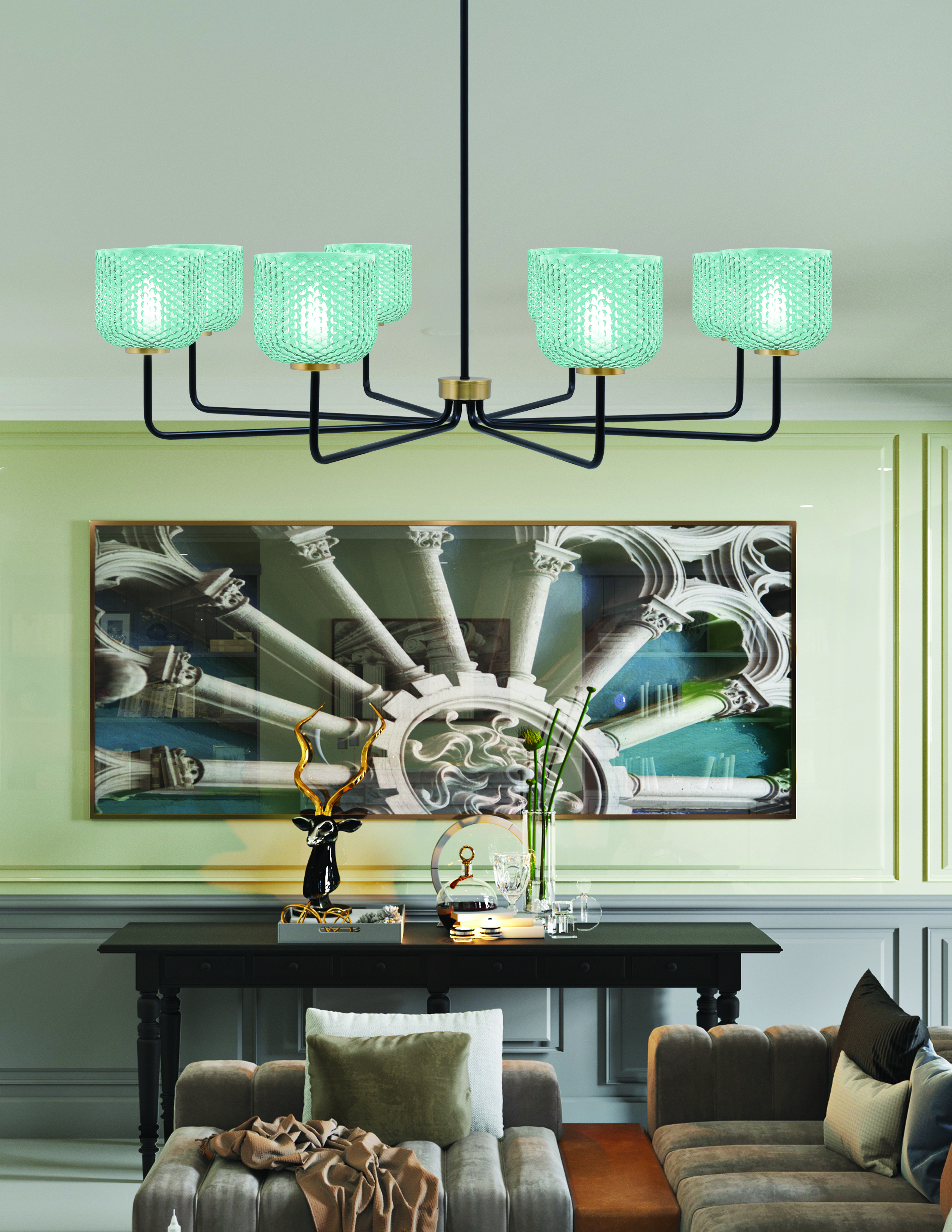 Elevate your home””½”Ô¢””½””””½””s ambiance with the Sandia 8-Light Chandelier. Featuring a stylish Matte Black & New Age Brass Finish, paired with stunning 6″ Turquoise Textured Glass Shades, this chandelier adds a touch of artistic flair to any space. The textured glass enhances the light with a soft yet vibrant glow, creating an inviting atmosphere.