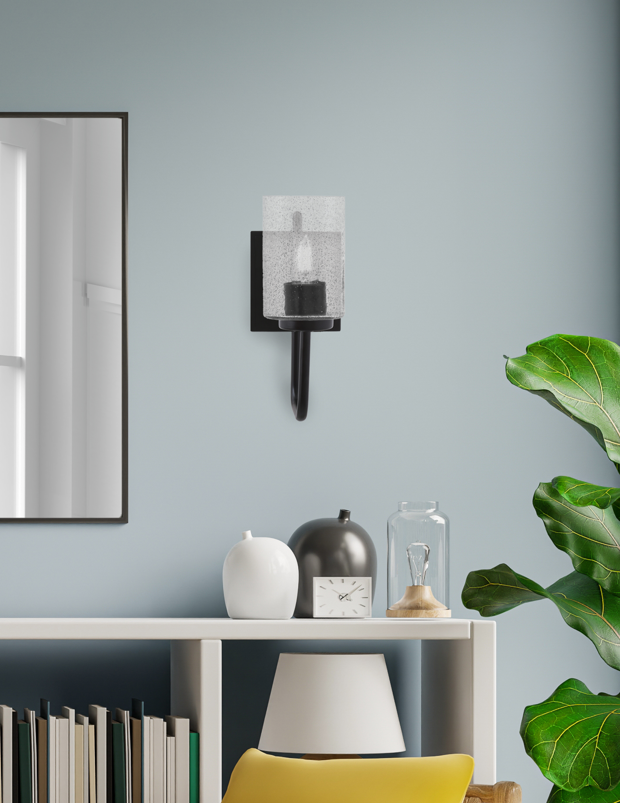 Enhance your space with the Sandia 1 Light Wall Sconce, offering a perfect balance of modern style and artistic flair. The matte black finish provides a bold, contemporary look, while the 4″ smoke bubble glass shade adds depth and intrigue with its textured design. The smoky tint softens the light, creating a cozy and inviting atmosphere.