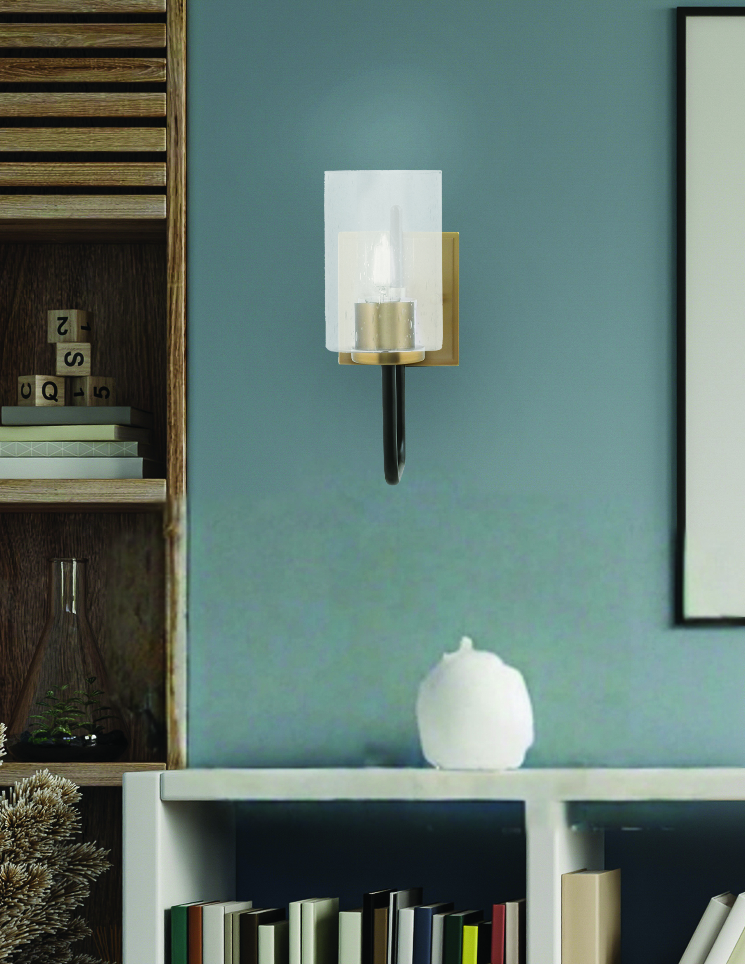 The Sandia 1 Light Wall Sconce combines modern sophistication with artistic charm. Its Matte Black and New Age Brass finishes provide a bold, contemporary aesthetic, while the 4″ Clear Bubble Glass shade adds a playful texture that diffuses light beautifully. This sleek sconce offers both style and function.